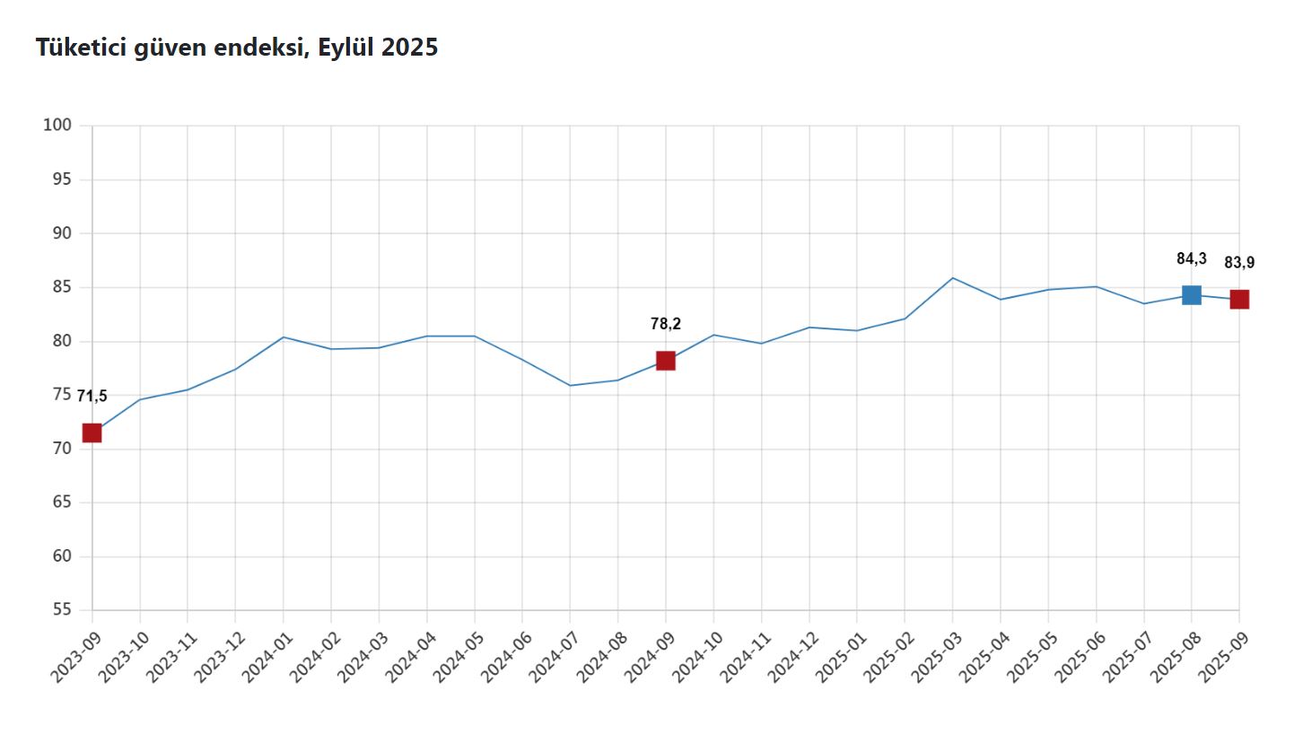TÜİK, Eylül 2025 dönemine ilişkin tüketici güven endeksi verilerini açıkladı. Buna göre; tüketici güven endeksi, bir önceki aya göre yüzde 0,4 oranında azalarak 83,9 oldu. Alt endekslerdeki değişim oranlarına bakıldığında; mevcut dönemde hanenin maddi durumu endeksi yüzde 3,2 azalarak 67,8, gelecek 12 aylık dönemde hanenin maddi durum beklentisi endeksi yüzde 0,2 artarak 84, gelecek 12 aylık dönemde genel ekonomik durum beklentisi endeksi yüzde 0,5 azalarak 78 ve gelecek 12 aylık dönemde dayanıklı tüketim mallarına harcama yapma düşüncesi endeksi 0,9 artarak 105,7 değerini aldı.
