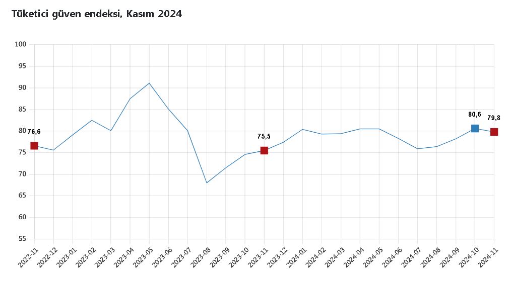 TÜİK, Kasım 2024 dönemine ilişkin tüketici güven endeksi verilerini açıkladı. Buna göre; TÜİK ve Türkiye Cumhuriyet Merkez Bankası iş birliği ile yürütülen tüketici eğilim anketi sonuçlarından hesaplanan tüketici güven endeksi, bir önceki aya göre yüzde 1 azalarak 79,8 oldu.