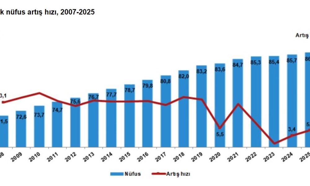 TÜİK, 2025 yılına ilişkin Adrese Dayalı Nüfus Kayıt Sistemi (ADNKS) sonuçlarını açıkladı. Buna göre; Türkiyede ikamet eden nüfus, 31 Aralık 2025 tarihi itibarıyla bir önceki yıla göre 427 bin 224 kişi artarak 86 milyon 92 bin 168 kişi oldu. Erkek nüfus 43 milyon 59 bin 434 kişi olurken, kadın nüfus 43 milyon 32 bin 734 kişi oldu. Diğer bir ifadeyle toplam nüfusun yüzde 50,02sini erkekler, yüzde 49,98ini ise kadınlar oluşturdu. ADNKS sonuçlarına göre, Türkiyede ikamet eden yabancı nüfus bir önceki yıla göre 38 bin 968 kişi artarak 1 milyon 519 bin 515 kişi oldu. Bu nüfusun yüzde 49,3ünü erkekler, yüzde 50,7sini kadınlar oluşturdu.
