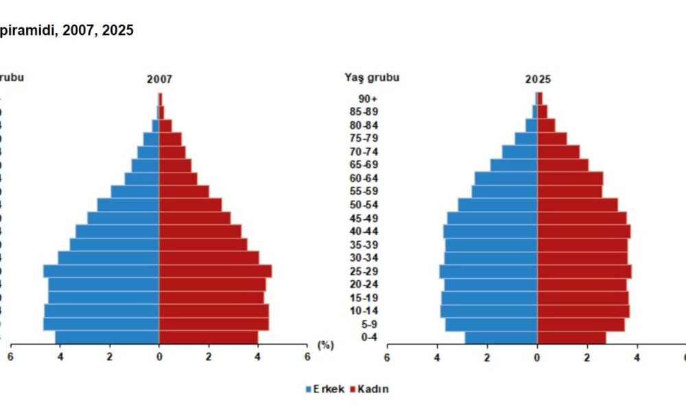 Türkiyenin 2007 ve 2025 yılı nüfus piramitleri karşılaştırıldığında, doğurganlık ve ölümlülük hızlarındaki azalmaya bağlı olarak, yaşlı nüfusun arttığı ve ortanca yaşın yükseldiği görüldü. Türkiyede 2024 yılında 34,4 olan ortanca yaş, 2025 yılında 34,9a yükseldi. Cinsiyete göre incelendiğinde, ortanca yaşın erkeklerde 33,7den 34,2ye, kadınlarda ise 35,2den 35,7ye yükseldiği görüldü. Ortanca yaşın illere göre dağılımına bakıldığında, Sinopun 44 ile en yüksek ortanca yaş değerine sahip il olduğu görüldü. Sinopu, 43,5 ile Giresun ve 43,3 ile Kastamonu izledi. Diğer yandan 21,8 ile Şanlıurfa en düşük ortanca yaşa sahip il oldu. Şanlıurfayı, 23,3 ile Şırnak ve 25 ile Siirt takip etti.