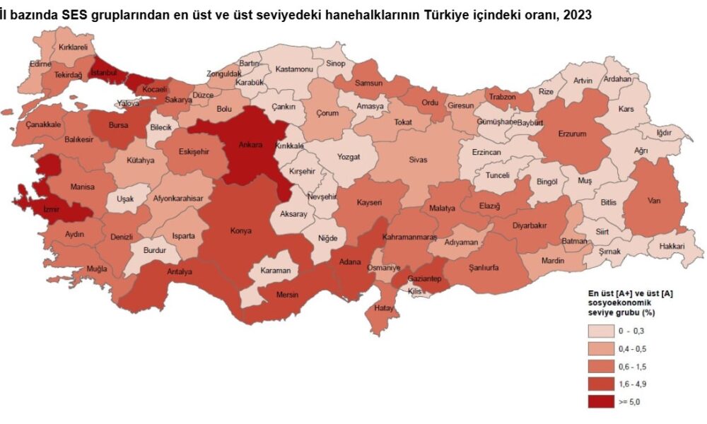 İl düzeyinde en üst ve üst sosyoekonomik seviye gruplarındaki hanehalkları, Türkiye içindeki oranlarına göre sıralandığında, bu seviyelerdeki hanehalklarının en fazla olduğu iller yüzde 28,6 ile İstanbul, yüzde 11,5 ile Ankara, yüzde 6,7 ile İzmir, yüzde 3,9 ile Bursa ve yüzde 3,3 ile Antalya oldu. İlçe düzeyinde en üst ve üst sosyoekonomik seviye gruplarındaki hanehalkları, Türkiye içindeki oranlarına göre sıralandığında, bu seviyelerdeki hanehalklarının en fazla olduğu ilçeler sırasıyla yüzde 4,1 ile Çankaya (Ankara), yüzde 2,4 ile Kadıköy (İstanbul), yüzde 1,9 ile Yenimahalle (Ankara) oldu.