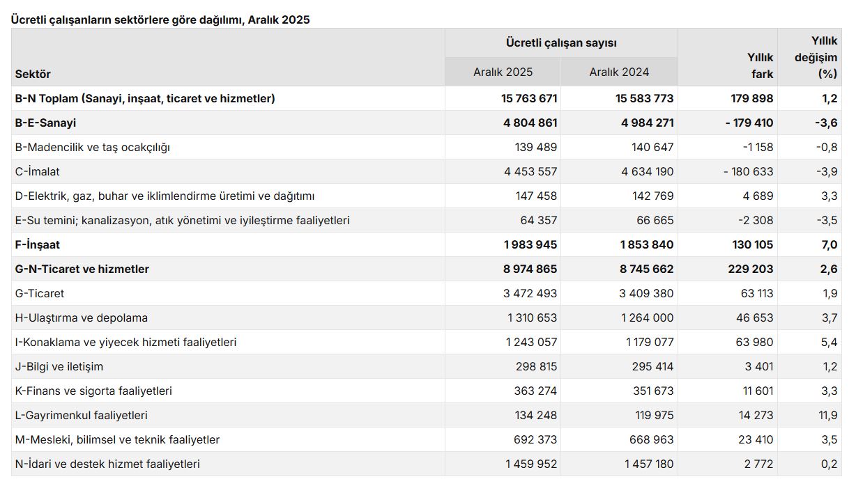 Sanayi, inşaat ve ticaret-hizmet sektörleri toplamında ücretli çalışan sayısı 2025 Aralık ayında bir önceki aya göre yüzde 0,1 arttı. Ücretli çalışanların alt detaylarına bakıldığında; 2025 Aralık ayında ücretli çalışanlar aylık olarak sanayi sektöründe yüzde 0,1 azaldı, inşaat sektöründe yüzde 0,6 arttı ve ticaret-hizmet sektöründe yüzde 0,2 arttı.