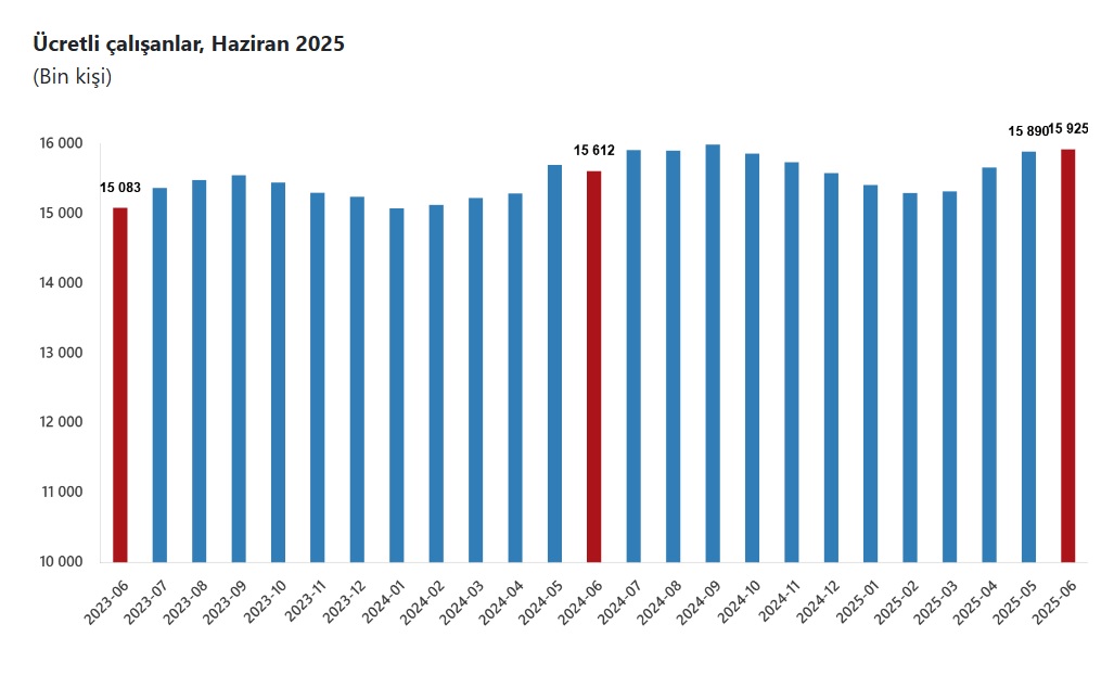 TÜİK, Haziran 2025 dönemine ilişkin ücretli çalışan istatistiklerini açıkladı. Buna göre; sanayi, inşaat ve ticaret-hizmet sektörleri toplamında ücretli çalışan sayısı bir önceki yılın aynı ayına göre yüzde 2 arttı. Ücretli çalışan sayısı bir önceki yılın aynı ayında 15 milyon 612 bin 472 kişi iken, 2025 yılı Haziran ayında 15 milyon 925 bin 359 kişi oldu. Ücretli çalışanların alt detaylarına bakıldığında; ücretli çalışan sayısı yıllık olarak sanayi sektöründe yüzde 2,1 azaldı, inşaat sektöründe yüzde 8,2 arttı ve ticaret-hizmet sektöründe yüzde 3,1 arttı.