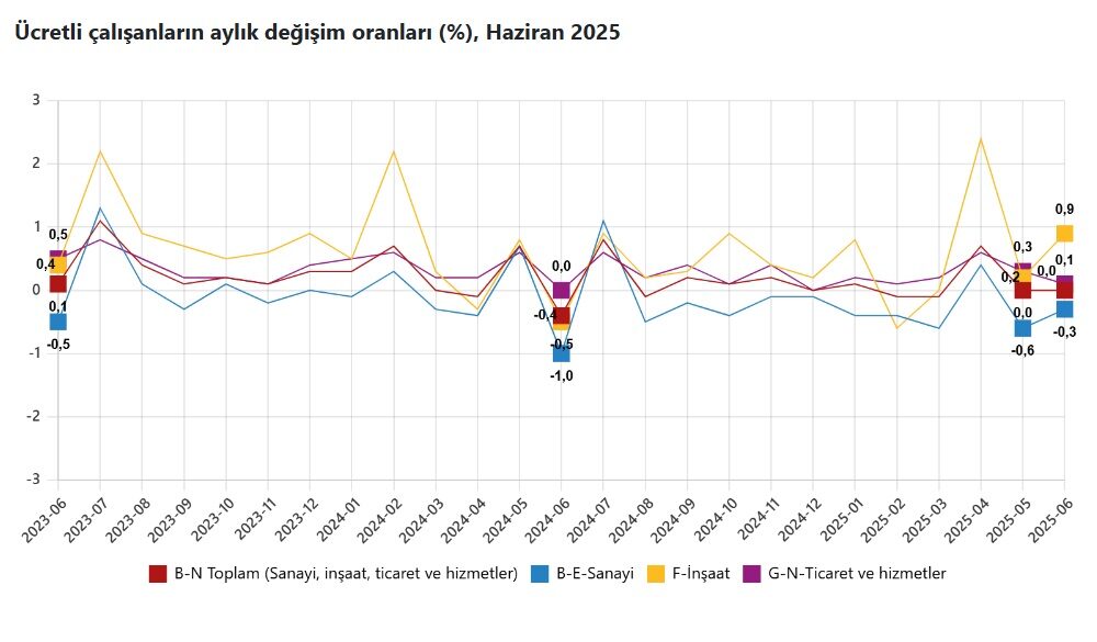 Sanayi, inşaat ve ticaret-hizmet sektörleri toplamında ücretli çalışan sayısı, bir önceki aya göre yüzdesel olarak değişim göstermedi. Ücretli çalışanların alt detaylarına bakıldığında; ücretli çalışanlar aylık olarak sanayi sektöründe yüzde 0,3 azaldı, inşaat sektöründe yüzde 0,9 arttı ve ticaret-hizmet sektöründe yüzde 0,1 arttı.