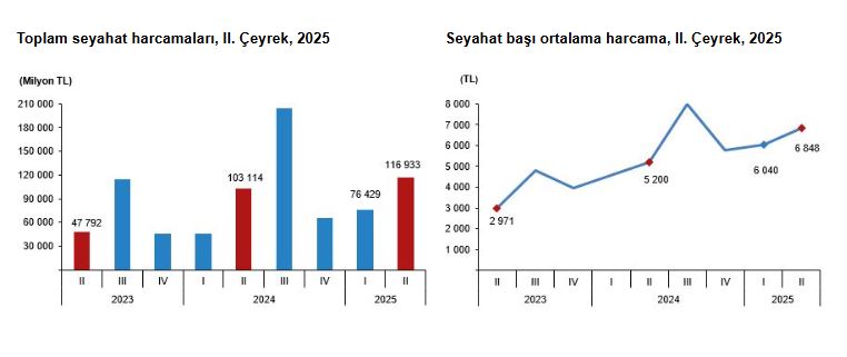 TÜİK, 2025 yılı 2nci çeyreğine ilişkin hanehalkı yurt içi turizm istatistiklerini açıkladı. Buna göre; yurt içinde ikamet eden 13 milyon 938 bin kişi seyahate çıktı. Seyahate çıkanların bir ve daha fazla geceleme kaydıyla ülke içinde yaptıkları toplam seyahat sayısı bir önceki yılın aynı çeyreğine göre yüzde 13,9 azalıp 17 milyon 76 bin seyahat olarak gerçekleşti. Bu çeyrekte seyahate çıkanlar 99 milyon 214 bin geceleme yaptı. Ortalama geceleme sayısı 5,8 gece oldu.
