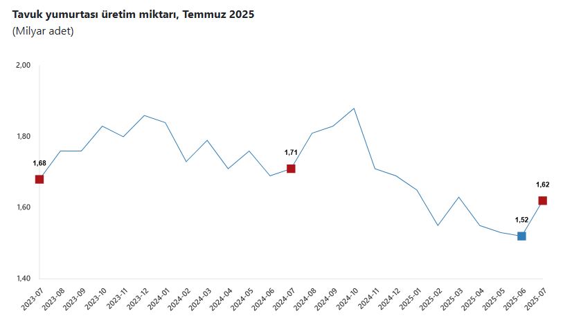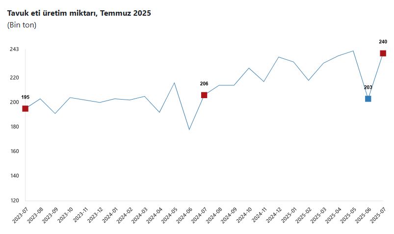 Temmuz ayında bir önceki yılın aynı ayına göre, tavuk yumurtası üretimi yüzde 4,9 azaldı, kesilen tavuk sayısı yüzde 14,8 arttı, tavuk eti üretimi yüzde 16,6 arttı. Ocak-temmuz döneminde ise bir önceki yılın aynı dönemine göre, tavuk yumurtası üretimi yüzde 9,7 azaldı, kesilen tavuk sayısı yüzde 11,4 arttı, tavuk eti üretimi yüzde 14,5 arttı.