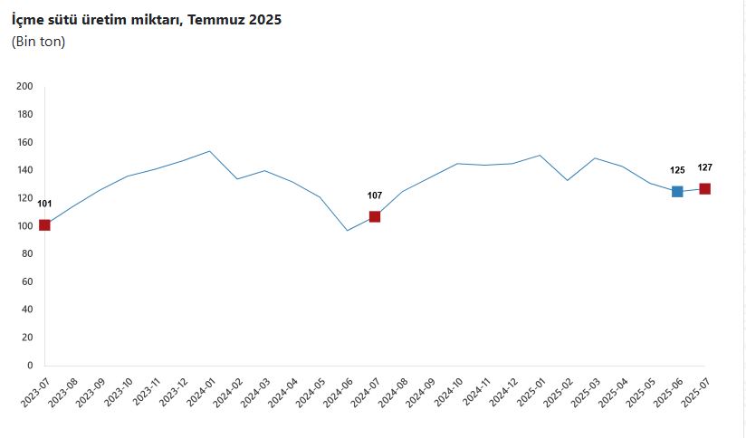 Ticari süt işletmeleri tarafından toplanan inek sütü miktarı, temmuz ayında bir önceki yılın aynı ayına göre yüzde 0,3 arttı, ocak-temmuz döneminde ise bir önceki yılın aynı dönemine göre yüzde 0,7 arttı. Temmuz ayında bir önceki yılın aynı ayına göre, inek peyniri üretimi yüzde 3,2 arttı, ayran ve kefir üretimi yüzde 10 arttı, yoğurt üretimi yüzde 4,4 arttı, içme sütü üretimi yüzde 19,2 arttı, tereyağı ve sadeyağ üretimi yüzde 12,1 arttı. Ocak-temmuz döneminde ise bir önceki yılın aynı dönemine göre, inek peyniri üretimi yüzde 2 arttı, ayran ve kefir üretimi yüzde 8 arttı, yoğurt üretimi yüzde 3,9 arttı, içme sütü üretimi yüzde 8,4 arttı, tereyağı ve sadeyağ üretimi yüzde 10,6 arttı.