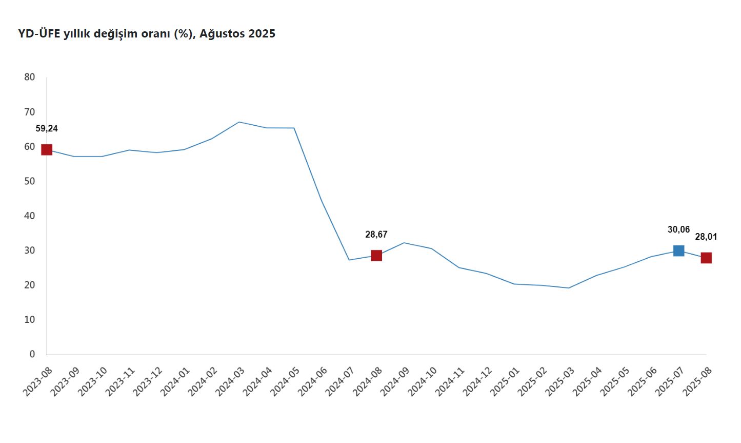 TÜİK, Ağustos 2025 dönemine ilişkin yurt dışı üretici fiyat endeksi verilerini açıkladı. Buna göre, yurt dışı üretici fiyatları, 2025 yılı ağustos ayında bir önceki aya göre yüzde 1,32, bir önceki yılın aralık ayına göre yüzde 25,03, bir önceki yılın aynı ayına göre yüzde 28,01 ve 12 aylık ortalamalara göre yüzde 25,47 arttı.