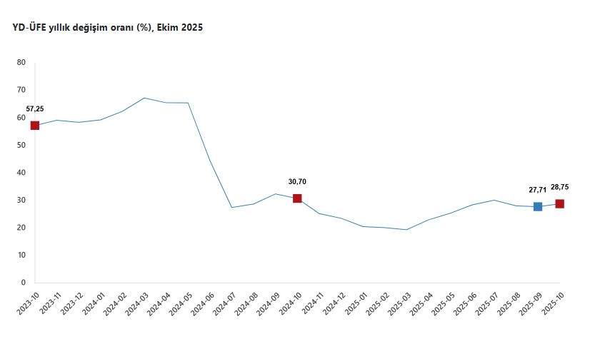 TÜİK, Ekim 2025 dönemine ilişkin yurt dışı üretici fiyat endeksi verilerini açıkladı. Buna göre; yurt dışı üretici fiyatları ekim ayında bir önceki aya göre yüzde 0,90, bir önceki yılın aralık ayına göre yüzde 28,69, bir önceki yılın aynı ayına göre yüzde 28,75 artış ve 12 aylık ortalamalara göre yüzde 25,13 arttı.