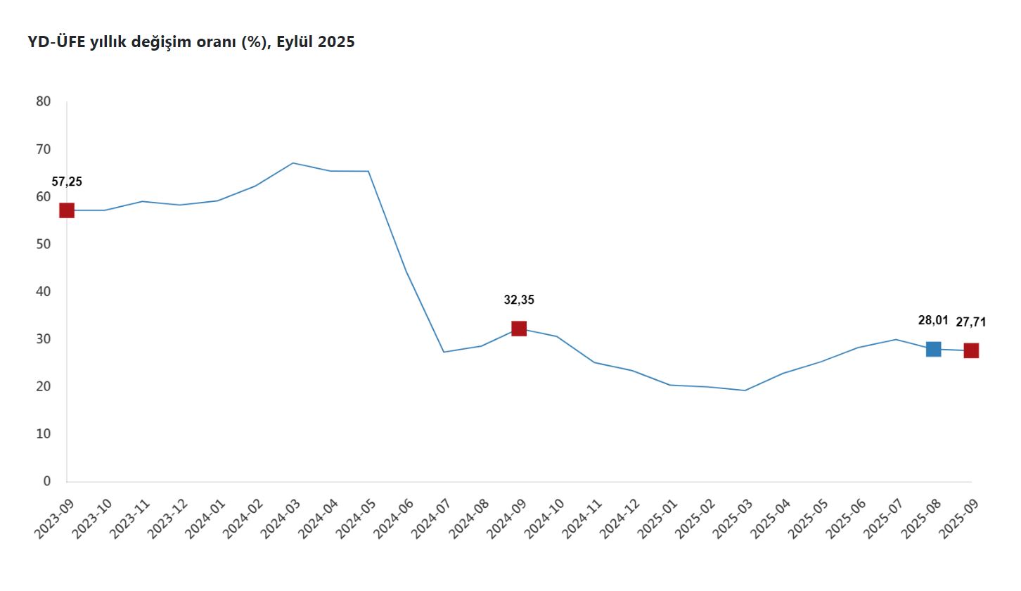 TÜİK, Eylül 2025 dönemine ilişkin yurt dışı üretici fiyat endeksi verilerini açıkladı. Buna göre; yurt dışı üretici fiyatları bir önceki aya göre yüzde 2,01, bir önceki yılın aralık ayına göre yüzde 27,55, bir önceki yılın aynı ayına göre yüzde 27,71 ve 12 aylık ortalamalara göre yüzde 25,19 arttı. Sanayinin iki sektörünün yıllık değişimleri; madencilik ve taş ocakçılığında yüzde 27,06 artış, imalatta yüzde 27,72 artış olarak gerçekleşti. Ana sanayi gruplarının yıllık değişimleri; ara mallarında yüzde 24,54 artış, dayanıklı tüketim mallarında yüzde 33,50 artış, dayanıksız tüketim mallarında yüzde 33,45 artış, enerjide yüzde 22,76 artış, sermaye mallarında yüzde 26,91 artış olarak gerçekleşti.