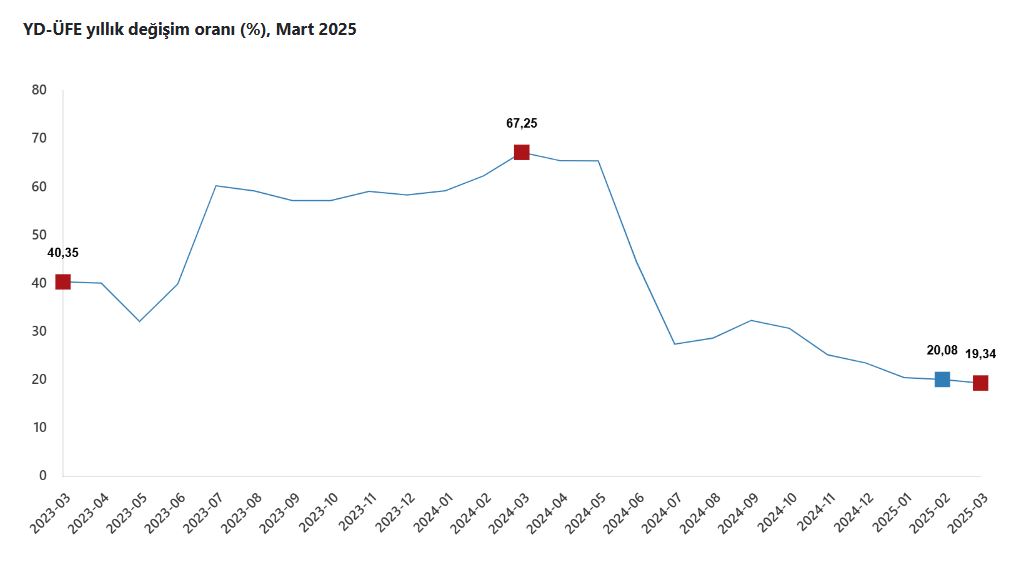 TÜİK, Mart 2025 dönemine ilişkin yurt dışı üretici fiyat endeksi verilerini açıkladı. Buna göre; yurt dışı üretici fiyatları bir önceki aya göre yüzde 4,06, bir önceki yılın aralık ayına göre yüzde 8,32, bir önceki yılın aynı ayına göre yüzde 19,34 ve 12 aylık ortalamalara göre yüzde 31,43 arttı.