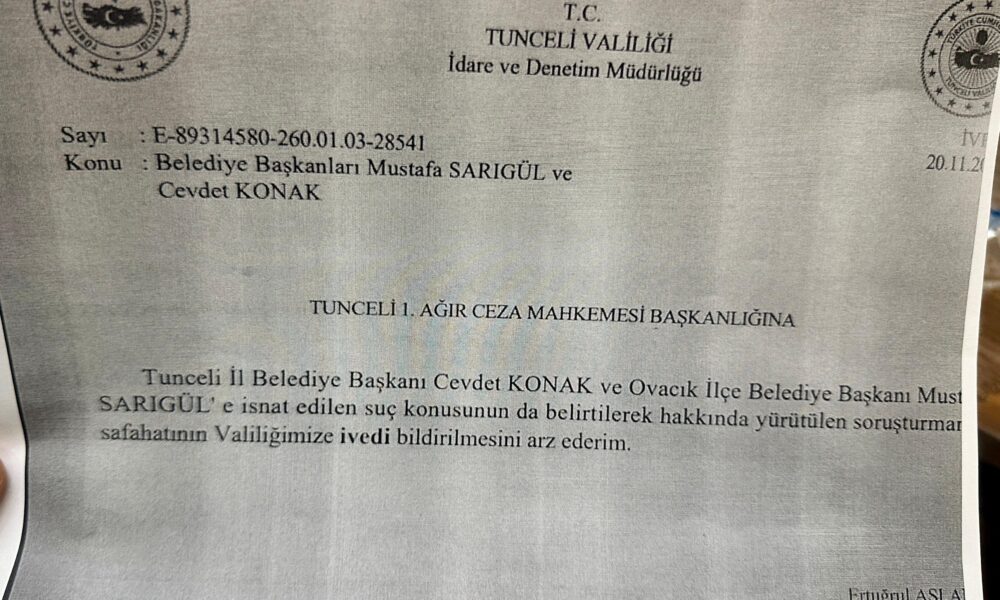 Tunceli Belediye Başkanı DEM Partili Cevdet Konak ile Ovacık Belediye Başkanı CHP’li Mustafa Sarıgül, Terör örgütüne üye olma suçlamasıyla yargılandıkları davada 6 yıl 3er ay hapis cezasına çarptırıldı. Cevdet Konak, Tunceli Valiliği tarafından davanın sürdüğü sırada mahkemeye evrak gönderildiğini öne sürerek, “Dün mahkeme devam ederken Tunceli Valiliği tarafından, Tunceli 1’inci Ağır Ceza Mahkemesi Başkanlığına gönderilen bir yazı var. Yazıda ‘Tunceli İl Belediye Başkanı Cevdet Konak ve Ovacık İlçe Belediye Başkanı Mustafa Sarıgül’e istinat edilen suç konusunda, hakkında yürütülen soruşturmanın safahatı valiliğimize ivedi bildirilmesi arz ederim’ deniliyor. Dün mahkeme devam ederken mahkeme heyeti üzerinde siyasi bir baskı oluşturulmuş. ‘Bir an önce bu siyasi kararı verin’ demişlerdir. Biz bunu böyle değerlendiriyoruz. Bu verilen ceza Dersim Belediyesine, Dersim halkının iradesine yönelik alınmış bir siyasi karar olarak görüyoruz. Kararı tanımıyoruz. Hak, hukuk, adalet varsa bir üst mahkemede kendi haklarımızı takip edeceğiz ve inanıyorum ki biz üst mahkemelerde de beratla sonuçlanacaktır” dedi.