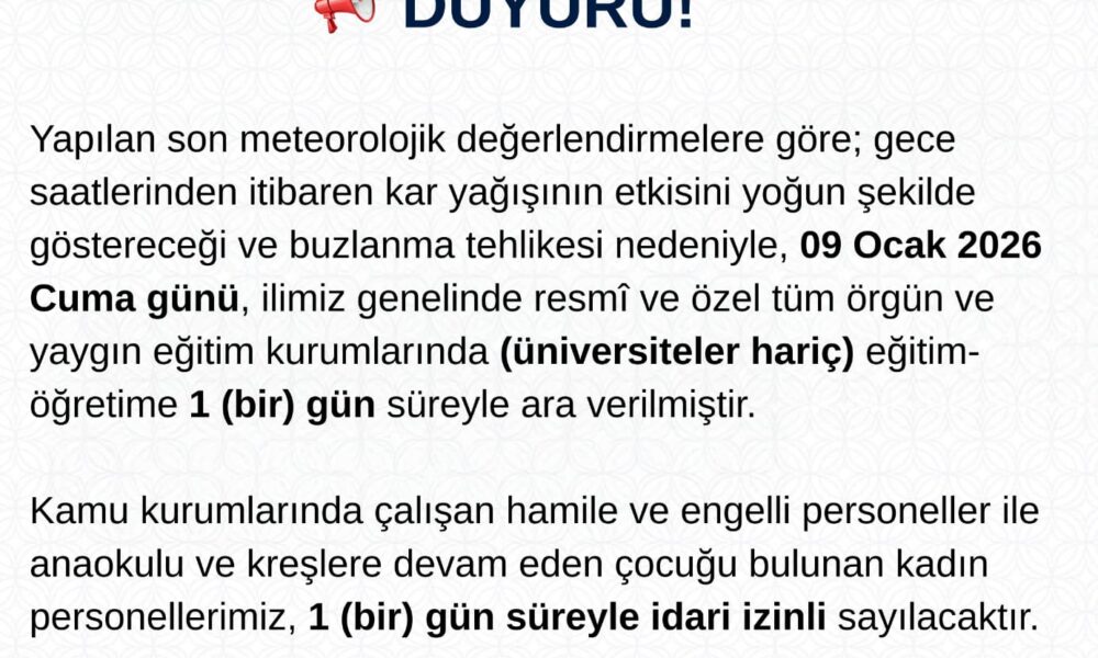 Tunceli Valiliğinden yapılan açıklamada, kent genelindeki resmi ve özel tüm örgün ve yaygın eğitim kurumlarında eğitime 9 Ocak Cuma günü ara verildiği belirtilerek, “Yapılan son meteorolojik değerlendirmelere göre; gece saatlerinden itibaren kar yağışının etkisini yoğun şekilde göstereceği ve buzlanma tehlikesi nedeniyle, 09 Ocak 2026 Cuma günü, ilimiz genelinde resmi ve özel tüm örgün ve yaygın eğitim kurumlarında (üniversiteler hariç) eğitim-öğretime 1 (bir) gün süreyle ara verilmiştir. Kamu kurumlarında çalışan hamile ve engelli personeller ile anaokulu ve kreşlere devam eden çocuğu bulunan kadın personellerimiz, 1 (bir) gün süreyle idari izinli sayılacaktır” denildi.