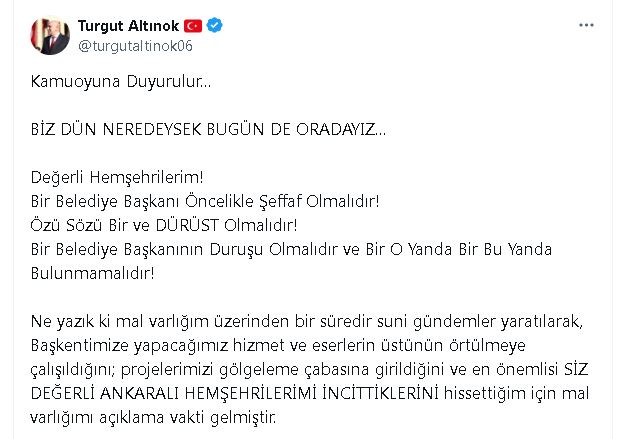 AK Parti Ankara Büyükşehir Belediye başkan adayı Turgut Altınok, mal varlığını açıkladı. Altınokun, mal varlığı listesinde 60 ayrı gayrimenkul yer aldı. Turgut Altınok, sosyal medya hesabından yaptığı açıklamada, “Biz dün neredeysek bugün de oradayız. Değerli hemşerilerim, bir belediye başkanı öncelikle şeffaf olmalıdır. Özü sözü bir ve dürüst olmalıdır. Bir belediye başkanının duruşu olmalıdır ve bir o yanda bir bu yanda bulunmamalıdır. Ne yazık ki mal varlığım üzerinden bir süredir suni gündemler yaratılarak, başkentimize yapacağımız hizmet ve eserlerin üstünün örtülmeye çalışıldığını; projelerimizi gölgeleme çabasına girildiğini ve en önemlisi siz değerli Ankaralı hemşerilerimi incittiklerini hissettiğim için mal varlığımı açıklama vakti gelmiştir. Değerli Ankaralılar, içinizde en ufak bir tereddüt olmasın. Ekte sunduğum tüm mal varlığım ana sütü gibi ak ve helaldir” ifadelerini kullandı.Altınokun açıkladığı mal varlığı listesinde 60 ayrı gayrimenkul yer aldı.