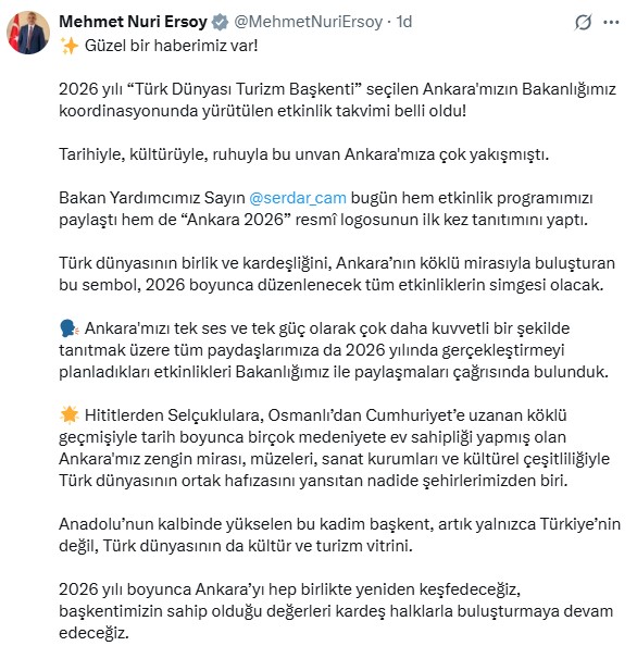 Bakan Ersoy, Nsosyal hesabından yaptığı açıklamada, “Güzel bir haberimiz var. 2026 yılı Türk Dünyası Turizm Başkenti seçilen Ankaramızın Bakanlığımız koordinasyonunda yürütülen etkinlik takvimi belli oldu. Tarihiyle, kültürüyle, ruhuyla bu ünvan Ankaramıza çok yakışmıştı. Bakan Yardımcımız Sayın Serdar Çam bugün hem etkinlik programımızı paylaştı hem de Ankara 2026 resmi logosunun ilk kez tanıtımını yaptı. Türk dünyasının birlik ve kardeşliğini, Ankaranın köklü mirasıyla buluşturan bu sembol, 2026 boyunca düzenlenecek tüm etkinliklerin simgesi olacak” dedi.