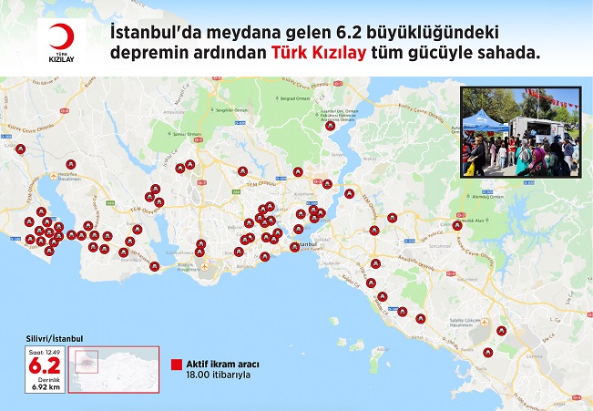 Türk Kızılay’dan yapılan açıklamada, “Marmara Denizi’nin Silivri açıklarında meydana gelen 6,2 büyüklüğündeki depremin hemen ardından gelişmeleri yakından takip ediyoruz. Afet Müdahale Merkezi ile ekiplerimizi hızla sahaya sevk ettik. Saat 18.00 itibarıyla İstanbul genelinde binden fazla çalışan ve gönüllü ile 65 mobil ikram aracımız güvenlik endişesiyle evlerine giremeyen vatandaşlarımıza çorba, kumanya, soğuk-sıcak içecek ve su dağıtımını kesintisiz sürdürüyor” ifadeleri kullanıldı.