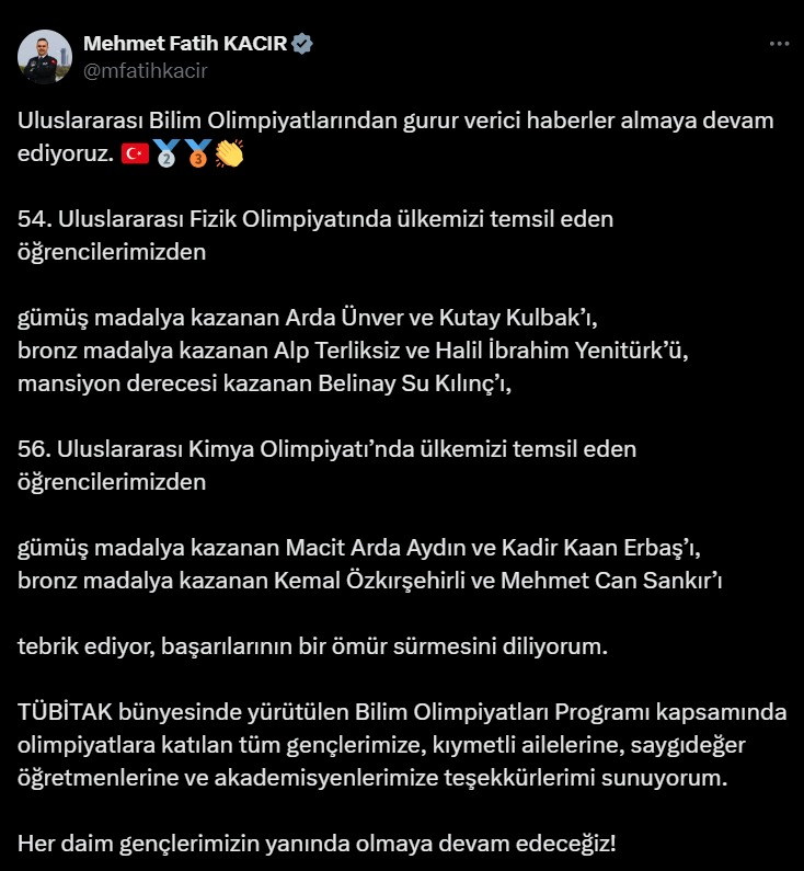 Sanayi ve Teknoloji Bakanı Mehmet Fatih Kacır, sosyal medya hesabından yaptığı açıklamada öğrencileri tebrik ederek, “Uluslararası Bilim Olimpiyatlarından gurur verici haberler almaya devam ediyoruz. 54üncü Uluslararası Fizik Olimpiyatında ülkemizi temsil eden öğrencilerimizden gümüş madalya kazanan Arda Ünver ve Kutay Kulbakı, bronz madalya kazanan Alp Terliksiz ve Halil İbrahim Yenitürkü, mansiyon derecesi kazanan Belinay Su Kılınçı, 56ncı Uluslararası Kimya Olimpiyatında ülkemizi temsil eden öğrencilerimizden gümüş madalya kazanan Macit Arda Aydın ve Kadir Kaan Erbaşı, bronz madalya kazanan Kemal Özkırşehirli ve Mehmet Can Sankırı tebrik ediyor, başarılarının bir ömür sürmesini diliyorum. TÜBİTAK bünyesinde yürütülen Bilim Olimpiyatları Programı kapsamında olimpiyatlara katılan tüm gençlerimize, kıymetli ailelerine, saygıdeğer öğretmenlerine ve akademisyenlerimize teşekkürlerimi sunuyorum. Her daim gençlerimizin yanında olmaya devam edeceğiz” dedi.