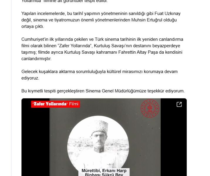 Kültür ve Turizm Bakanı Mehmet Nuri Ersoy, konuya ilişkin NSosyal hesabından yaptığı açıklamada, “Türk sinema tarihine ışık tutan önemli bir bulguya ulaştık. Arşiv çalışmalarımız kapsamında, uzun yıllardır kayıp olduğu düşünülen Zafer Yollarında filmine ait görüntüler tespit edildi. Yapılan incelemelerde, bu tarihi yapımın yönetmeninin sanıldığı gibi Fuat Uzkınay değil, sinema ve tiyatromuzun önemli ismi Muhsin Ertuğrul olduğu ortaya çıktı. Gelecek kuşaklara aktarma sorumluluğuyla kültürel mirasımızı korumaya devam ediyoruz. Bu kıymetli tespiti gerçekleştiren Sinema Genel Müdürlüğümüze ve tüm ekip arkadaşlarıma teşekkür ediyorum” ifadelerini kullandı.