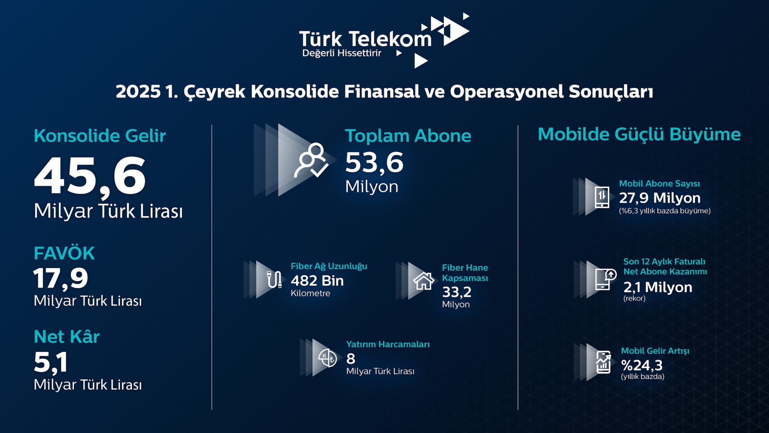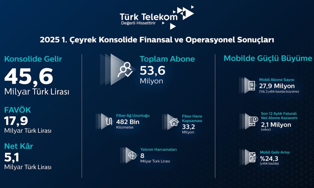 Türk Telekom, 2025 yılı birinci çeyrek finansal ve operasyonel sonuçlarını açıkladı. Böylece konsolide gelirleri yıllık bazda yüzde 18,3’lük artışla 45,6 milyar TL’ye yükseldi. FAVÖK’ü (Faiz, amortisman ve vergi öncesi kâr) yüzde 26,5 artarak 17,9 milyar TL’ye yükselen Türk Telekom’un, FAVÖK marjı ise yıllık bazda 260 baz puan iyileşme ile yüzde 39,3 oldu. Şirketin ilk çeyrekteki net karı yıllık bazda yüzde 45,2’lik artışla 5,1 milyar TL’ye ulaştı ve 2025’in ilk çeyreğinde yıllık bazda yüzde 27,7’lik artışla 8 milyar TL’lik yatırım gerçekleştirdi.