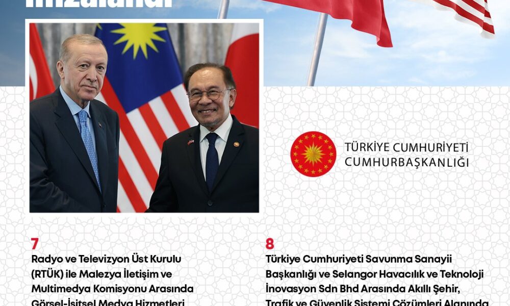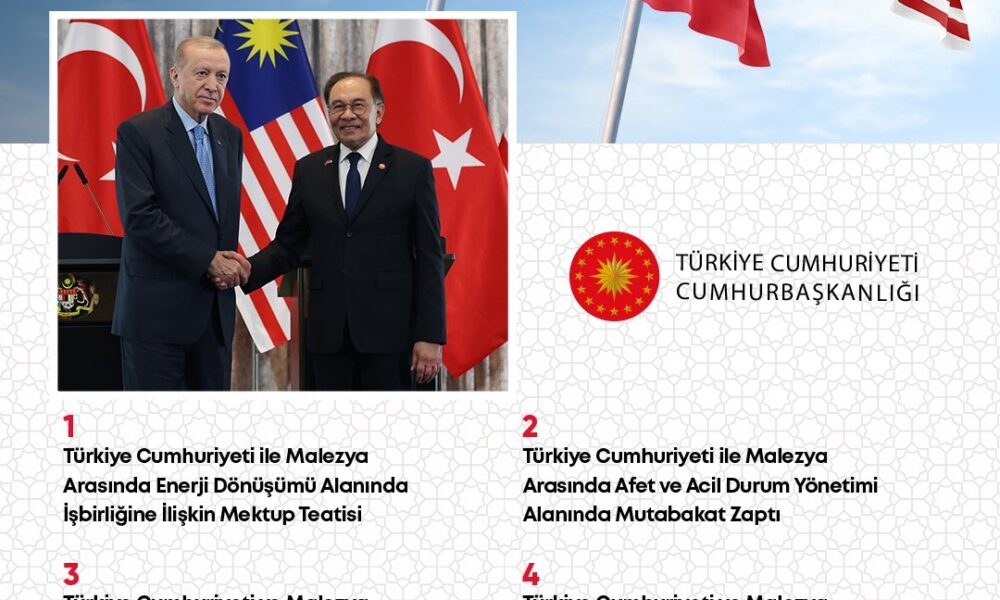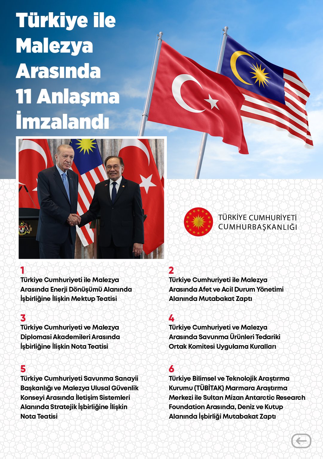 Cumhurbaşkanı Recep Tayyip Erdoğan ve Malezya Başbakanı Enver İbrahim, baş başa ve heyetler arası görüşmelerin ardından iki ülke arasındaki anlaşmaların imza törenine geçti. Törende Türkiye ile Malezya arasında enerji dönüşümü alanında iş birliğine ilişkin mektup teatisi, afet ve acil durum yönetimi alanında mutabakat zaptı ile Türkiye Cumhuriyeti ve Malezya diplomasi akademileri arasında iş birliğine ilişkin nota teatisi imzalandı.