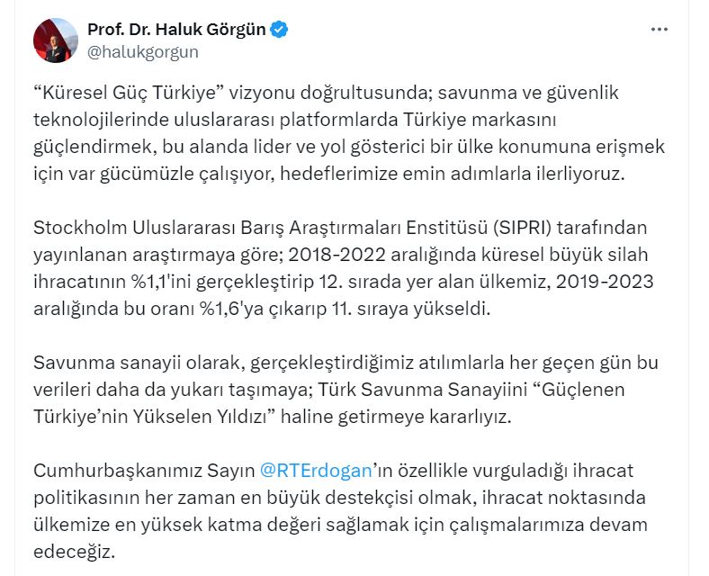 CUMHURBAŞKANLIĞI Savunma Sanayii Başkanı Haluk Görgün, 2018-2022 aralığında küresel büyük silah ihracatının yüzde 1,1ini gerçekleştirip, 12nci sırada yer alan Türkiyenin 2019-2023 aralığında bu oranı yüzde 1,6ya çıkararak 11inci sıraya yükseldiğini duyurdu.Savunma Sanayii Başkanı Görgün, sosyal medya hesabından yaptığı açıklamada, “Küresel Güç Türkiye vizyonu doğrultusunda; savunma ve güvenlik teknolojilerinde uluslararası platformlarda Türkiye markasını güçlendirmek, bu alanda lider ve yol gösterici bir ülke konumuna erişmek için var gücümüzle çalışıyor, hedeflerimize emin adımlarla ilerliyoruz. Stockholm Uluslararası Barış Araştırmaları Enstitüsü (SIPRI) tarafından yayınlanan araştırmaya göre; 2018-2022 aralığında küresel büyük silah ihracatının yüzde 1,1ini gerçekleştirip 12nci sırada yer alan ülkemiz, 2019-2023 aralığında bu oranı yüzde 1,6ya çıkarıp 11inci sıraya yükseldi” dedi.Görgün, şunları kaydetti: “Savunma sanayii olarak, gerçekleştirdiğimiz atılımlarla her geçen gün bu verileri daha da yukarı taşımaya; Türk Savunma Sanayiini Güçlenen Türkiyenin Yükselen Yıldızı haline getirmeye kararlıyız. Cumhurbaşkanımız Sayın Recep Tayyip Erdoğanın özellikle vurguladığı ihracat politikasının her zaman en büyük destekçisi olmak, ihracat noktasında ülkemize en yüksek katma değeri sağlamak için çalışmalarımıza devam edeceğiz.”