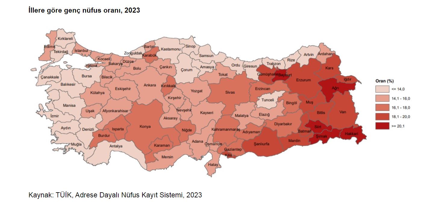ADNKS sonuçlarına göre 2023te genç nüfus oranının en yüksek olduğu il yüzde 21,5 ile Hakkari oldu. Bunu yüzde 21,1 ile Şırnak ve Siirt, yüzde 20,2 ile Bayburt izledi. Genç nüfus oranının en düşük olduğu il yüzde 12,1 ile Balıkesir oldu. Bu ili yüzde 12,2 ile Muğla ve yüzde 12,4 ile Ordu izledi.