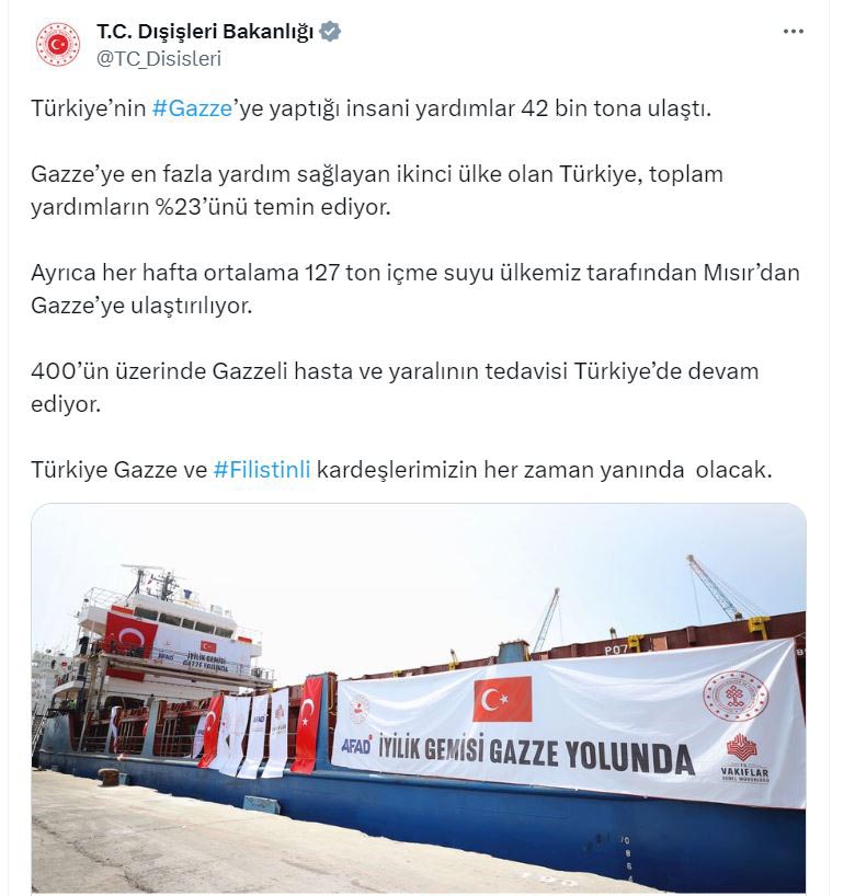 DIŞİŞLERİ Bakanlığı, Türkiyenin Gazzeye yaptığı insani yardımların 42 bin tona ulaştığını ve Türkiyenin her zaman Gazze ve Filistinlilerin yanında olacağını duyurdu.Bakanlıktan yapılan yazılı açıklamada, “Türkiyenin Gazzeye yaptığı insani yardımlar 42 bin tona ulaştı. Gazzeye en fazla yardım sağlayan ikinci ülke olan Türkiye, toplam yardımların yüzde 23ünü temin ediyor. Ayrıca her hafta ortalama 127 ton içme suyu ülkemiz tarafından Mısırdan Gazzeye ulaştırılıyor. 400ün üzerinde Gazzeli hasta ve yaralının tedavisi Türkiyede devam ediyor. Türkiye, Gazze ve Filistinli kardeşlerimizin her zaman yanında olacak” denildi.