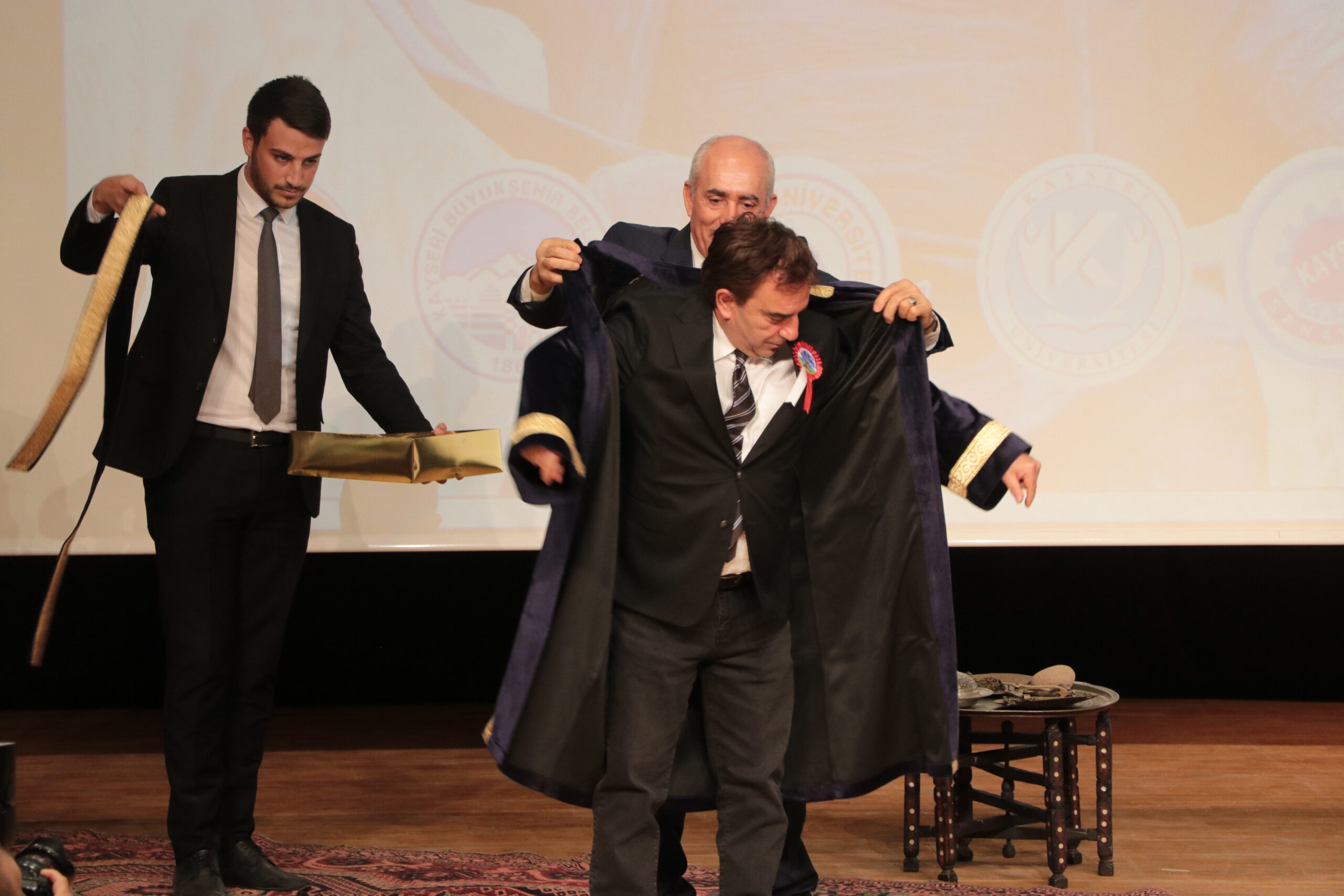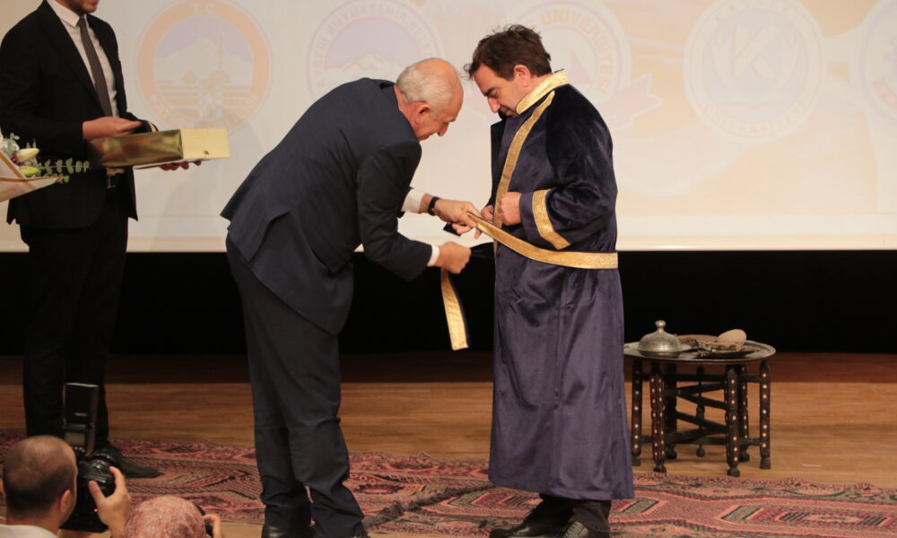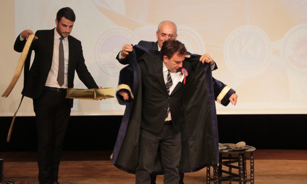 Prof. Dr. Fatih Altunun konuşmasının ardından Ayşe Baldöktü Mesleki Eğitim Merkezi öğretmenleri, şet kuşatmayı canlandırdı. Şet kuşatmanın ardından Türkiyenin ilk siber ahisi seçilen ve Covid-19 aşısı Turkovacı geliştiren ERÜ Prof. Dr. Aykut Özdarendeliye kafan giydirilerek plaket takdim edildi.