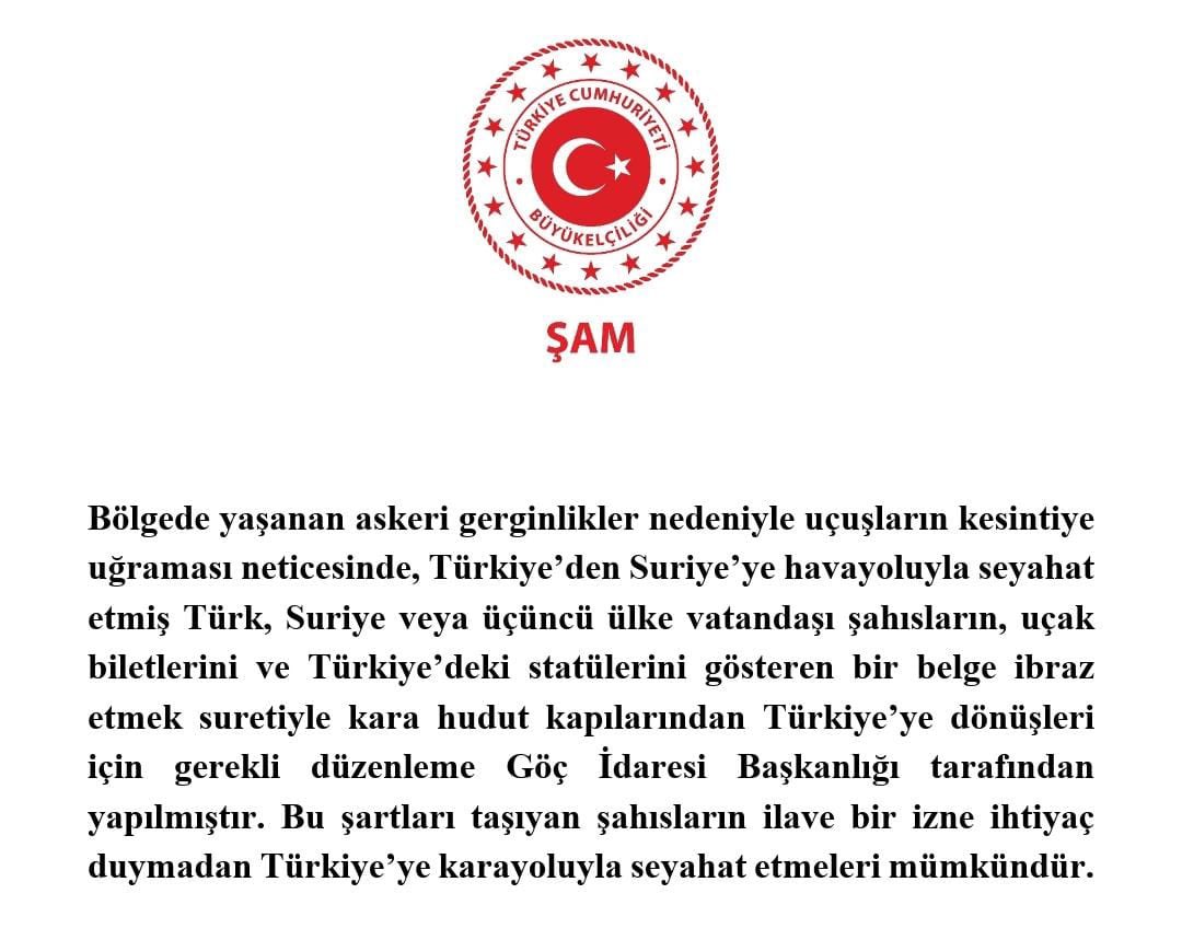 Türkiye’nin Şam Büyükelçiliği’nin sosyal medya hesabından yapılan açıklama, “Bölgede yaşanan askeri gerginlikler nedeniyle uçuşlarının kesintiye uğraması neticesinde, Türkiye’den Suriye’ye hava yoluyla seyahat etmiş Türk, Suriye ve üçüncü ülke vatandaşı şahısların, uçak biletlerini ve Türkiye’deki statülerini gösteren bir belge ibraz etmek suretiyle kara hudut kapılarından Türkiye’ye dönüşleri için gerekli düzenleme Göç İdaresi Başkanlığı tarafından yapılmıştır. Bu şartları taşıyan şahısların ilave izin ihtiyaç duymadan Türkiye’ye kara yoluyla seyahat etmeleri mümkündür” denildi.
