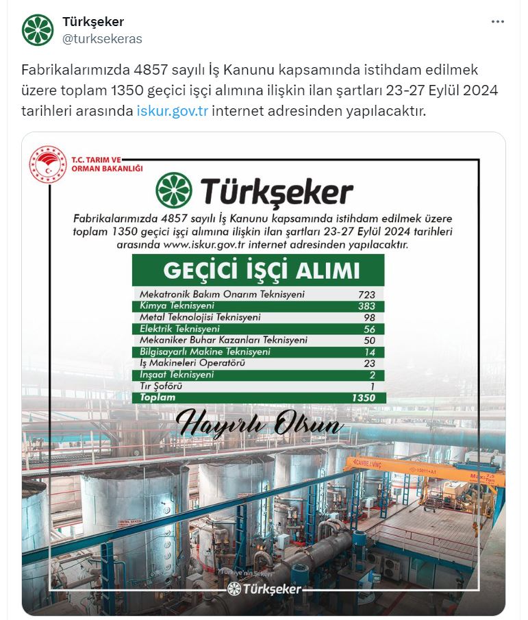 Şirketin sosyal medya hesabından yapılan açıklamada, “Fabrikalarımızda 4857 sayılı İş Kanunu kapsamında istihdam edilmek üzere toplam 1350 geçici işçi alımına ilişkin ilan şartları 23-27 Eylül 2024 tarihleri arasında http://iskur.gov.tr internet adresinden yapılacaktır” denildi.