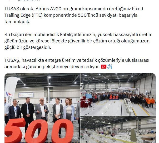 TUSAŞın sanal medya hesabından yapılan paylaşımda, “TUSAŞ olarak, Airbus A220 programı kapsamında ürettiğimiz Fixed Trailing Edge (FTE) komponentinde 500üncü sevkiyatı başarıyla tamamladık. Bu başarı ileri mühendislik kabiliyetlerimizin, yüksek hassasiyetli üretim gücümüzün ve küresel ölçekte güvenilir bir çözüm ortağı olduğumuzun güçlü bir göstergesidir. TUSAŞ, havacılıkta entegre üretim ve tedarik çözümleriyle uluslararası arenadaki gücünü pekiştirmeye devam ediyor” ifadelerine yer verildi.