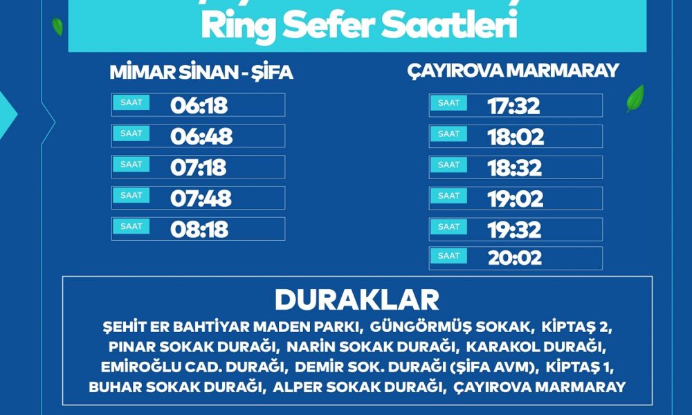 “Vatandaşlardan gelen talepler ve Marmaray hareket saatleri dikkate alınarak ring sefer saatlerinde düzenlemeye gidildi. Yeni düzenleme kapsamında seferler, 13 Ekim 2025 Pazartesi itibarıyla hafta içi her gün, sabah ve akşam yoğun saatlerde Marmaray bağlantılarına uygun şekilde hizmet vermeye başladı.
