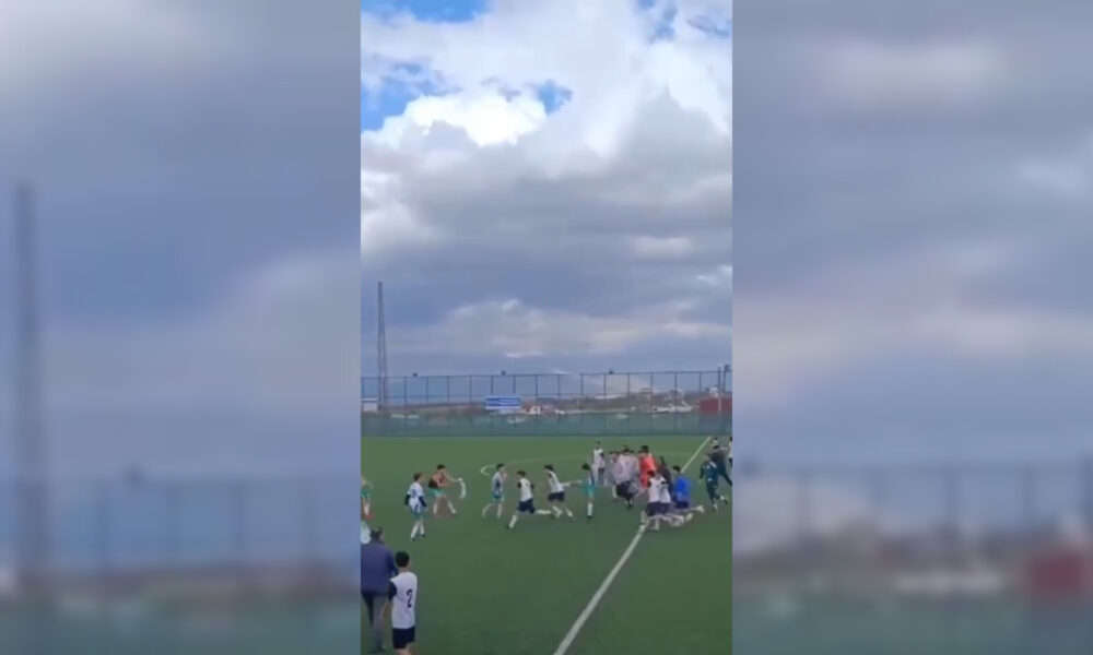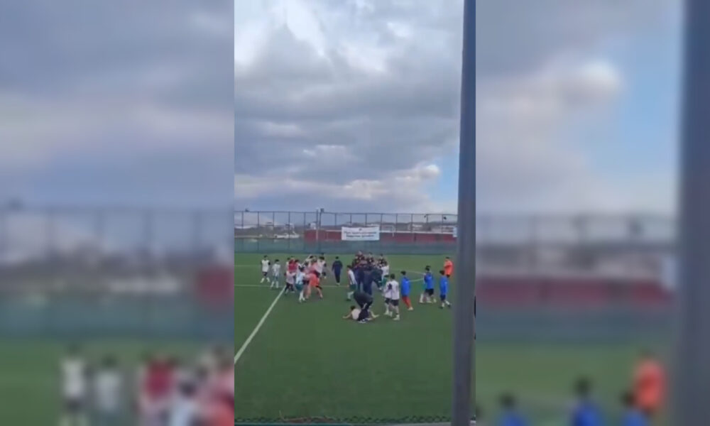 U-14 liginde futbolcuların maç sonu tekmeli yumruklu kavgası kamerada