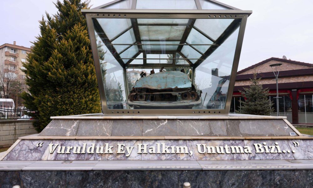 Uğur Mumcu’nun patlamada 3 parçaya bölünen 06 YR 245 plakalı otomobili, 8 yıldır Odunpazarı Belediyesi tarafından düzenlenen Büyükdere Mahallesi Buse Sokaktaki Uğur Mumcu Parkındaki mermer kaide üzerinde yaptırılan özel cam fanusta sergileniyor.