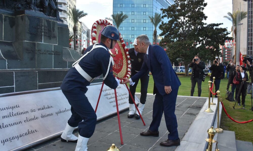 Türkiye Cumhuriyetinin kurucusu Ulu Önder Gazi Mustafa Kemal Atatürkün ölümünün 87nci yıl dönümünde İzmirde, çelenk töreni düzenlendi. Törende Cumhuriyet Meydanındaki Atatürk Anıtına İzmir Valiliği, Garnizon Komutanlığı ve İzmir Büyükşehir Belediyesine ait çelenkler konuldu. Törene, İzmir Valisi Süleyman Elban, Ege Ordusu ve Garnizon Komutanı Orgeneral İrfan Özsert, İzmir Büyükşehir Belediye Başkanı Cemil Tugay, milletvekilleri, STK ve oda temsilcileri ve kent protokolü katıldı. Törende, Gazi Mustafa Kemal Atatürkün bazı sözlerinin okunmasının ardından saat 09.05te 2 dakikalık saygı duruşunda bulunuldu. İstiklal Marşı eşliğinde Türk bayrağının göndere çekilip, yarıya indirilmesinin ardından tören sona erdi.
