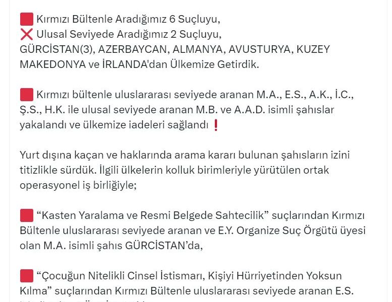 Bakan Yerlikaya, sosyal medya hesabından yaptığı açıklamada, yurt dışına kaçan ve haklarında arama kararı bulunan suçluların izini titizlikle sürdüklerini belirtti. Yerlikaya, “İlgili ülkelerin kolluk birimleriyle yürütülen ortak operasyonel iş birliğiyle; Kasten yaralama ve resmi belgede sahtecilik suçlarından kırmızı bültenle uluslararası seviyede aranan ve E.Y. Organize Suç Örgütü üyesi olan M.A. isimli şahıs Gürcistanda, Çocuğun nitelikli cinsel istismarı’, ‘Kişiyi hürriyetinden yoksun kılma suçlarından kırmızı bültenle uluslararası seviyede aranan E.S. isimli şahıs Gürcistanda, Kasten öldürme suçundan kırmızı bültenle uluslararası seviyede aranan A.K. isimli şahıs Gürcistanda, Kasten öldürme suçundan kırmızı bültenle uluslararası seviyede aranan İ.C. isimli şahıs Azerbaycanda, Bilişim sistemleri banka veya kredi kurumlarının araç olarak kullanılması suretiyle dolandırıcılık suçundan kırmızı bültenle uluslararası seviyede aranan Ş.S. isimli şahıs Almanyada, Taksirle ölüme ve yaralanmaya neden olma suçundan kırmızı bültenle uluslararası seviyede aranan H.K. isimli şahıs Avusturyada, Uyuşturucu veya uyarıcı madde ihraç etmeye teşebbüs suçundan ulusal seviyede aranan M.B. isimli şahıs Kuzey Makedonyada, Uyuşturucu veya uyarıcı madde ticareti yapma veya sağlama suçundan ulusal seviyede aranan A.A.D. isimli şahıs İrlandada yakalandı ve ülkemize iadeleri sağlandı” dedi.