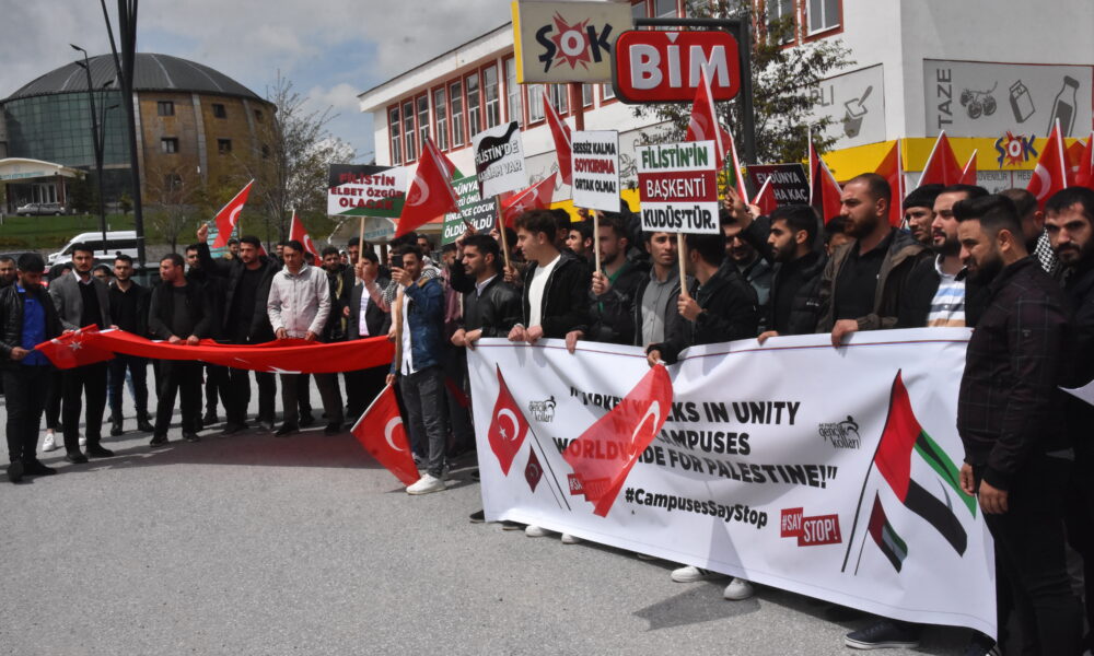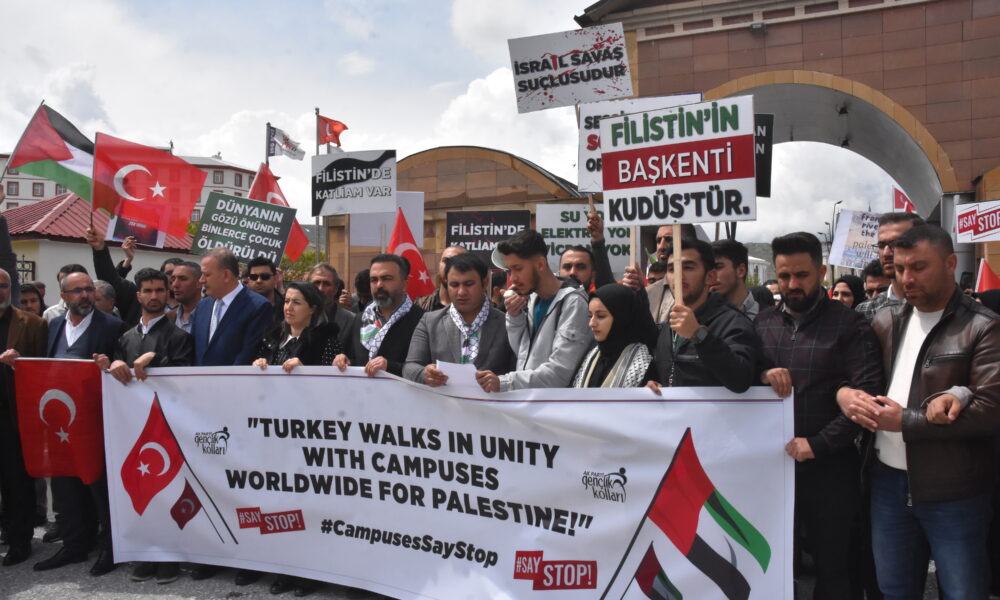 “Özellikle geçtiğimiz hafta ABDnin New York kentindeki Columbia Üniversitesinde öğrencilerin ve akademisyenlerin katılımıyla başlayan İsrail karşıtı gösteriler dünya genelinde onurlu duruşun başkaldırısının fitilini ateşlemiştir. ABD genelindeki onlarca kampüse yayılan ve bu insani duruşu derslerini iptal ettirmek, disiplin soruşturmasına sevk edilmek hatta tutuklanmak pahasına sergileyen, eylemlere katılan, sesini yükselten tüm kardeşlerimize AK Parti Gençlik Kolları, üniversiteler teşkilatı olarak yürekten teşekkür ediyoruz. Bizler de vicdan sahibi her bir genç gibi AK Parti Gençlik Kolları olarak Gazzede yaşanan katliama karşı on binlerce gencin katılımıyla ilk günden bugüne kadar gerçekleştirdiğimiz Saystop eylemlerimize, boykot çağrılarımıza ve yardım faaliyetlerimize ara vermeksizin devam edeceğimizi ve Gazze halkının çığlığına ses veren herkesin farklılıklarına bakmaksızın yanında olmaya devam edeceğimizi bildiriyoruz. Bitlis ÜniAK teşkilatları ve Bitlis Eren Üniversitesi öğrencileri olarak Gazzelilerin çığlıklarına kulak veren ABDnin Stanford Üniversitesi öğrencilerinin yanında olduğumuzu belirtiyor, 81 ilimizde bulunan bütün üniversiteli kardeşlerimizi ve akademisyenlerimizi İsrail barbarlığına karşı durmaya, Gazzeli kardeşlerimizin yanında olmaya ve Saystop eylemlerimize ses vermeye davet ediyoruz.”