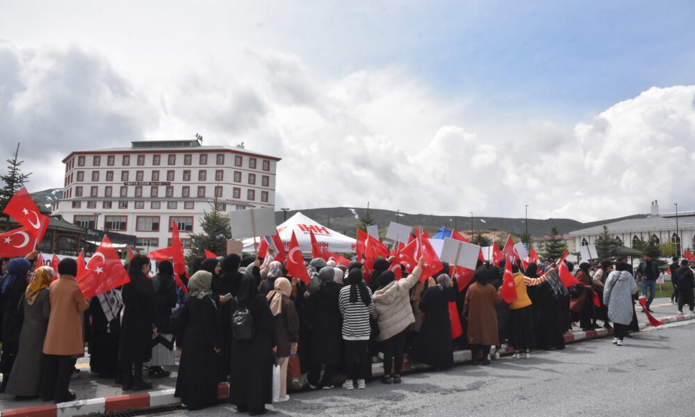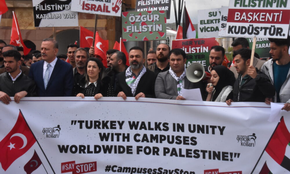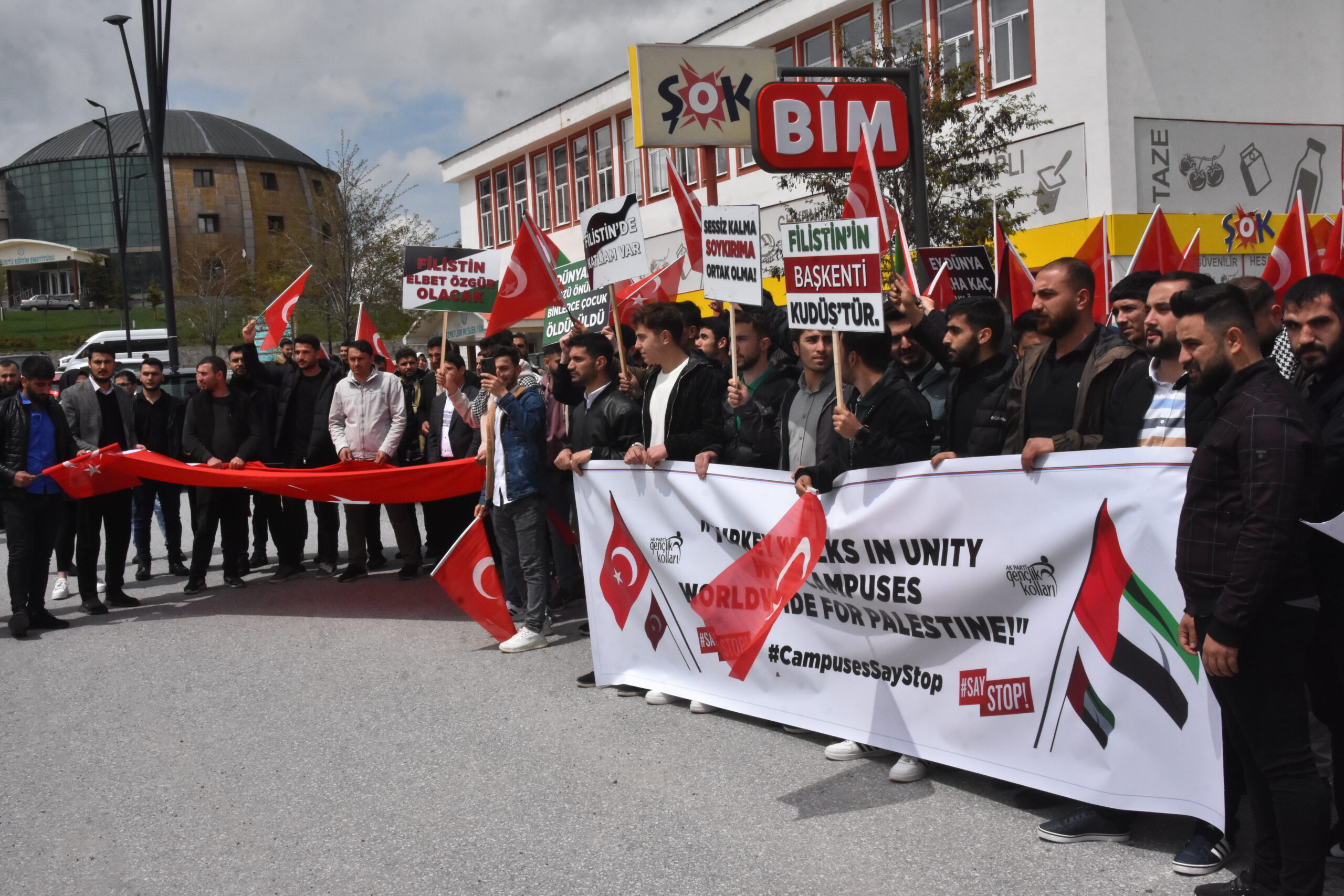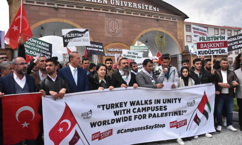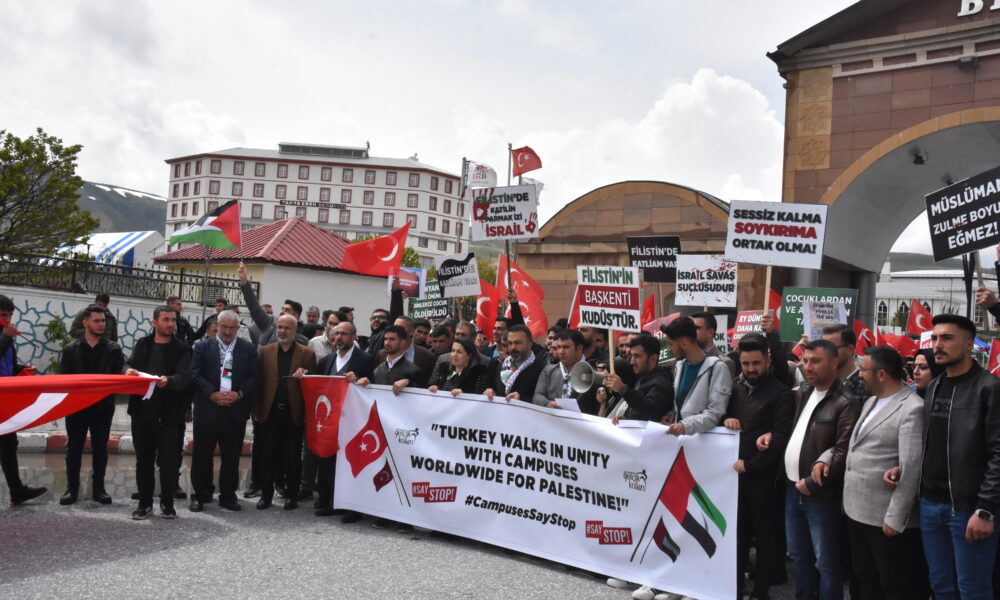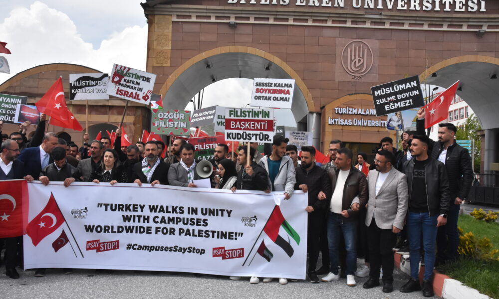 Bitlis Eren Üniversitesi Rahva Yerleşkesi’nde öğrenci ve akademisyenler tarafından düzenlenen yürüyüş ve basın açıklamasına Rektör Prof. Dr. Necmettin Elmastaş, AK Parti İl Başkanı Kadir Köstekçi, AK Parti İl Kadın Kolları Başkanı Çiğdem Ula, AK Parti İl Gençlik Kolları Başkanı Doğan Daldagül, İHH Bitlis Temsilcisi Muzaffer Taşcan da katıldı. Kampüste başlayan yürüyüş, kampüs girişine kadar sürdü. Sloganların atıldığı yürüyüş sonrası basın açıklaması İngilizce ve Türkçe olarak yapıldı. Basın açıklamasını okuyan öğrencilerden Mehmet Güzelsoy, 209 gündür çocuk, kadın, erkek, genç, yaşlı, engelli ayırt etmeksizin 35 bin kişinin İsrail tarafından katledildiğini, binlerce kişinin evinden, yurdundan göçe sürüklendiğini belirterek, şu ifadeleri kullandı: