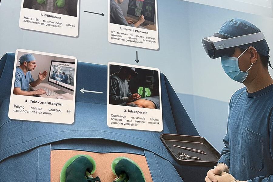 Projenin 3 aşamadan oluştuğunu söyleyen Yaşartürk, “İlk aşamada bilgisayarlı tomografi görüntülerini cerrahımız operasyondan önce planlama uygulamamıza yüklüyor. Bu planlama uygulamamızda, örnek verelim böbrek ameliyatında, böbrek ya da böbreklerin vücuttan açık ameliyat yöntemi ile çıkarılması işleminde böbrek üzerindeki kistleri bölümlere ayırıyoruz. Cerrah bu işlem için nereden girebilir, neler yapması gerekir planlamasını gerçekleştiriyor. Ardından bu aşamadan sonra arttırılmış gerçeklik gözlüğü üzerine biz bu verilerimizi gönderiyoruz. Bu sayede cerrahlara nasıl bir yol izlemeleri gerektiğine dair rehberlik sağlamayı amaçlıyoruz. İkinci aşamada, bu planlama verilerini artırılmış gerçeklik gözlüğüne aktarıyoruz. Operasyon sırasında hastanın üzerine yerleştirdiğimiz özel maddeler sayesinde, segmente ettiğimiz görüntüleri hastanın vücudu üzerine birebir yansıtıyoruz. Yani hastanın o anki anatomik konumları ile bizim hazırladığımız segmentasyon görüntüleri gerçek dünya üzerinde eşleşiyor. Üçüncü aşamada ise telekonsültasyon devreye giriyor. Eğer cerrah bir meslektaşından yardım almak ya da fikir danışmak isterse, dünyanın neresinde olursa olsun diğer cerrah aynı anda birebir aynı görüntüyü görebiliyor. Bu şekilde ikinci bir görüş alma imkanı doğuyor, yardım isteyebiliyor, fikir alışverişinde bulunabiliyor” diye konuştu.