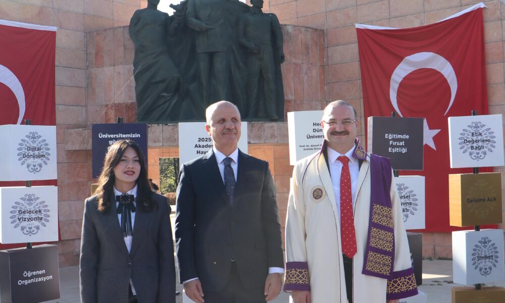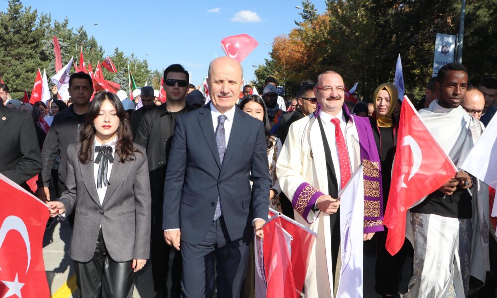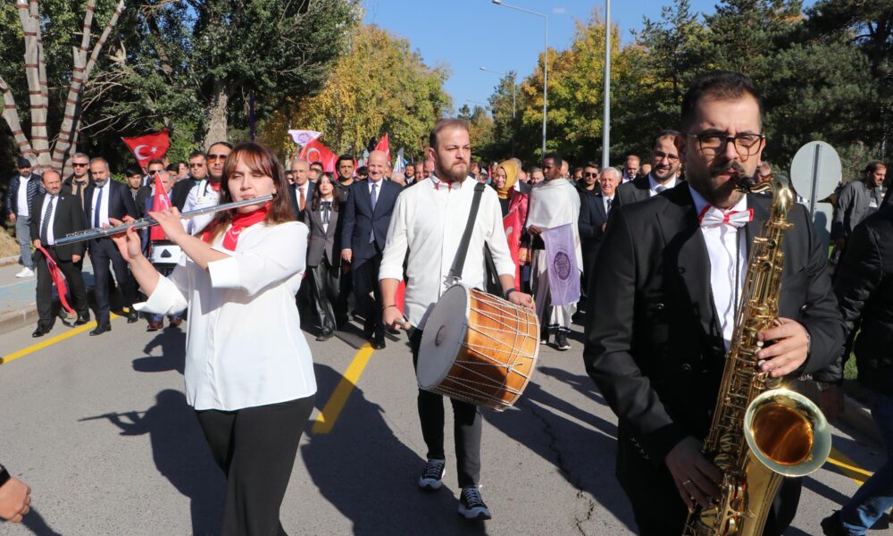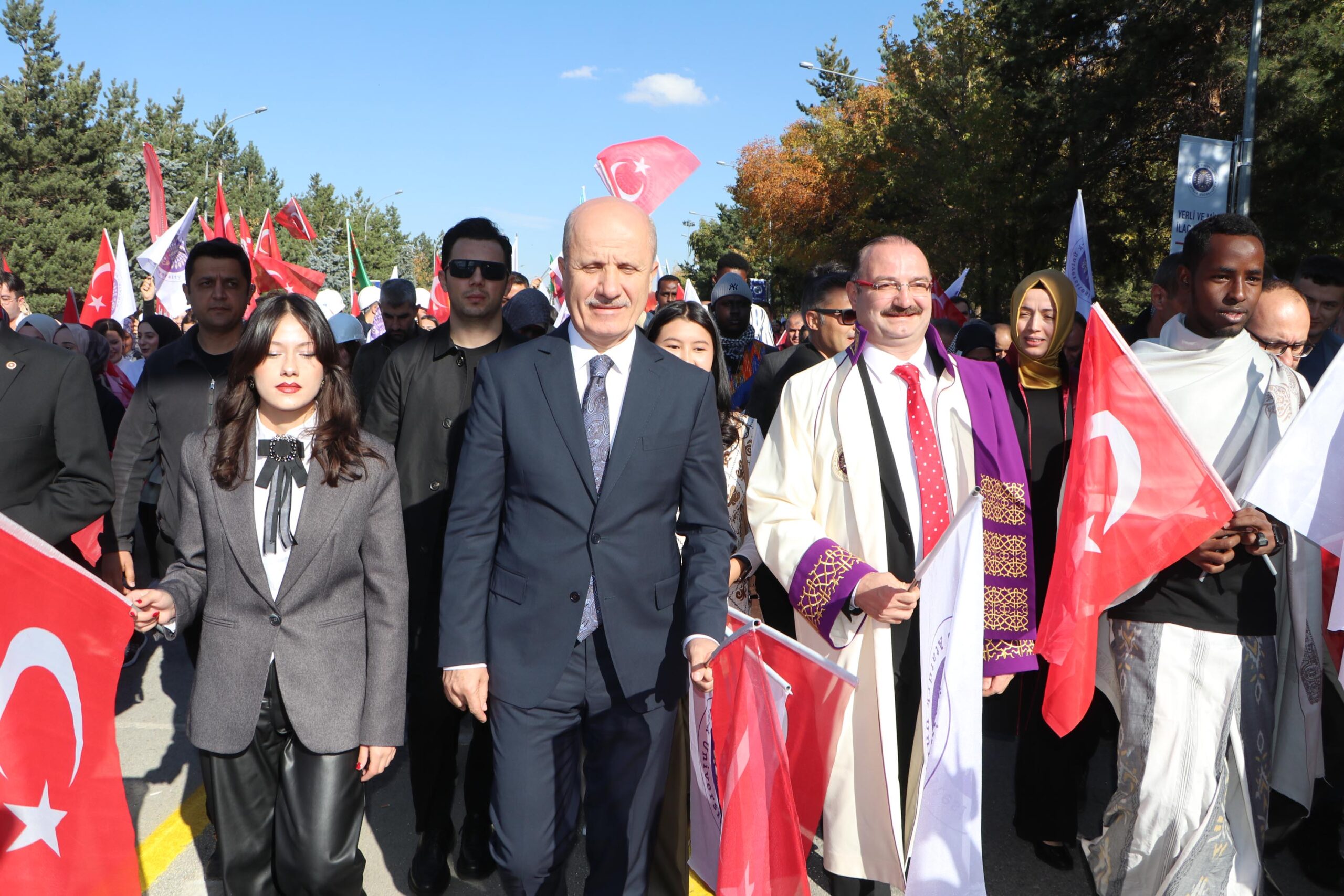 Atatürk Üniversitesi 2025-2026 Akademik Yılı açılış töreni YÖK Başkanı Prof. Dr. Erol Özvar, bölge üniversiteleri rektörleri, akademisyenler ile öğrencilerin katıldığı kortej yürüyüşüyle başladı. Bilim Anıtı önünde sona eren yürüyüşün ardından akademisyenlerden oluşan halk oyunları grubu gösteri yaptı. Tören 15 Temmuz Milli İrade Salonunda devam etti. Atatürk Üniversitesini tanıtan film ve İletişim Fakültesi tarafından Gazzede yaşanan soykırımı anlatan kısa film gösteriminin ardından kürsüye gelen Rektör Prof. Dr. Ahmet Hacımüftüoğlu, “Atatürk Üniversitesi; 14 bini ön lisans, 38 bini lisans, 8 bini yüksek lisans ve 2 bini aşkın doktora öğrencisiyle toplamda 63 bin öğrenciye ev sahipliği yapmaktadır. Açık ve uzaktan öğretim programlarımızda yer alan 578 bin öğrencimizle birlikte bu sayı 640 bine ulaşmaktadır. 94 farklı ülkeden 7 bin uluslararası öğrencimizin de aramıza katılmasıyla, üniversitemiz adeta kültürlerarası bir buluşma noktası haline gelmiştir. 23 fakültesi, 12 meslek yüksekokulu, 1 konservatuvarı, 1 yüksekokulu, 9 enstitüsü ve 44 araştırma merkeziyle eğitim, bilim ve kültür alanında güçlü bir ekosistem oluşturan Atatürk Üniversitesi, 2 bin 700’e yakın bilim insanı ve 750 bini aşan mezunuyla ülkesine ve insanlığa değer katmaya devam etmektedir” diye konuştu.