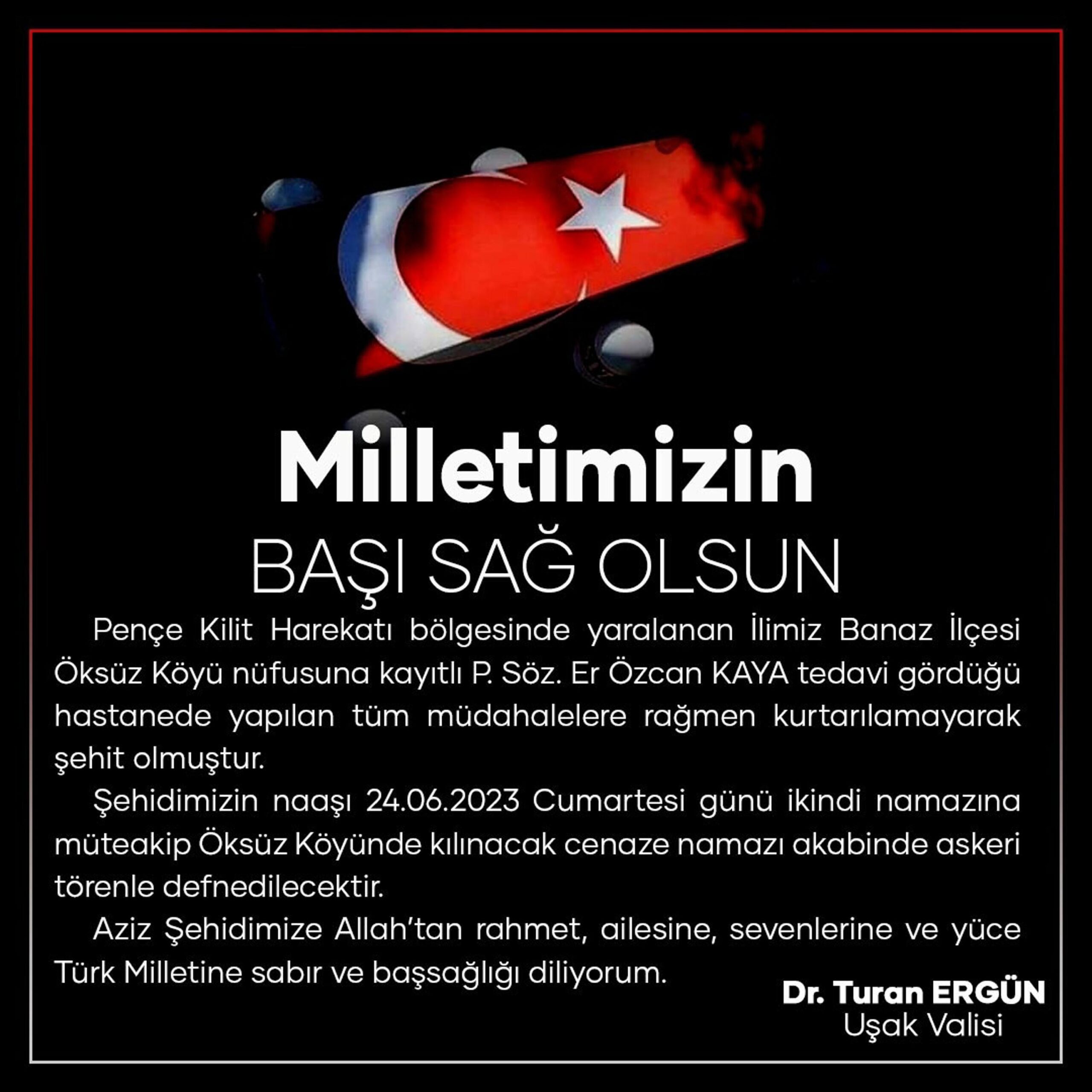 Pençe- Kilit Operasyonu bölgesinde görevini yaptığı sırada 15 Haziran’da teröristlerin açtığı taciz ateşinde yaralanan Piyade Sözleşmeli Er Özcan Kaya, GATA’ya kaldırıldı. Kaya, burada 8 gün verdiği yaşam mücadelesini kaybetti. Kaya’nın cenazesinin yarın ikindide memleketi Uşak’ın Banaz ilçesine bağlı Öksüz köyünde toprağa verileceği belirtildi. Konuya ilişkin Uşak Valiliği’nin sosyal medya hesabından yapılan açıklamada “Pençe Kilit Harekatı bölgesinde yaralanan ilimiz Banaz ilçesi Öksüz köyü nüfusuna kayıtlı P. Söz. Er Özcan Kaya, tedavi gördüğü hastanede yapılan tüm müdahalelere rağmen kurtarılamayarak şehit olmuştur. Şehidimizin naaşı 24 Haziran 2023 Cumartesi günü ikindi namazını müteakip Öksüz köyünde kılınacak cenaze namazı akabinde askeri törenle defnedilecektir. Aziz şehidimize Allah’tan rahmet, ailesine, sevenlerine ve yüce Türk milletine sabır ve başsağlığı diliyorum” ifadelerine yer verildi.