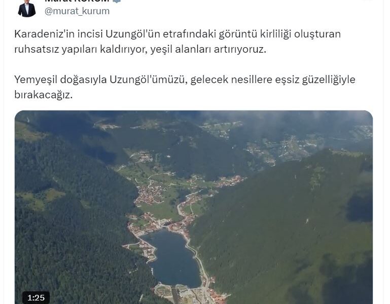 Bakan Kurum, sosyal medya hesabından Uzungölden yeni görüntüler paylaştı. Kurum, Uzungölün kenarındaki ruhsatsız yapıların kaldırılacağını ve bölgenin yeşil alana dönüştürüleceğini belirterek, “Karadenizin incisi Uzungölün etrafındaki görüntü kirliliği oluşturan ruhsatsız yapıları kaldırıyor, yeşil alanları artırıyoruz. Yemyeşil doğasıyla Uzungölümüzü, gelecek nesillere eşsiz güzelliğiyle bırakacağız” ifadelerini kullandı.