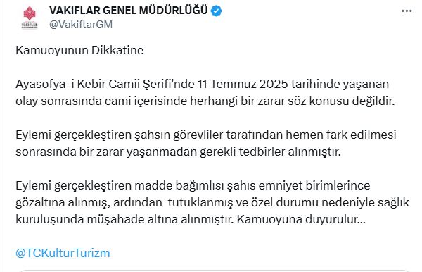 Vakıflar Genel Müdürlüğünden yapılan yazılı açıklamada, “Ayasofya-i Kebir Camii Şerifinde 11 Temmuz 2025 tarihinde yaşanan olay sonrasında cami içerisinde herhangi bir zarar söz konusu değildir. Eylemi gerçekleştiren şahsın görevliler tarafından hemen fark edilmesi sonrasında bir zarar yaşanmadan gerekli tedbirler alınmıştır. Eylemi gerçekleştiren madde bağımlısı şahıs, emniyet birimlerince gözaltına alınmış, ardından tutuklanmış ve özel durumu nedeniyle sağlık kuruluşunda müşahede altına alınmıştır” denildi.