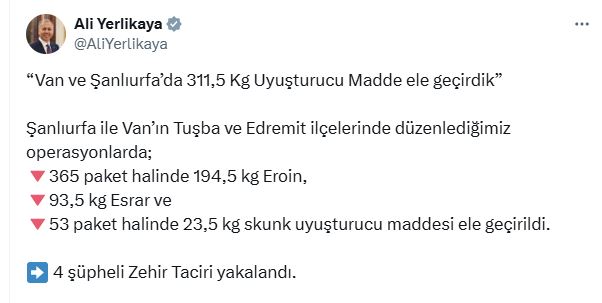 İçişleri Bakanı Ali Yerlikayanın, sosyal medya hesabından yaptığı açıklamaya göre; Van ve Şanlıurfa Cumhuriyet başsavcılıkları ile Emniyet Genel Müdürlüğü koordinesinde Şanlıurfa ile Vanın Tuşba ve Edremit ilçelerinde narkotik operasyonları düzenlendi. 4 şüphelinin gözaltına alındığı operasyonlarda, 365 paket halinde 194,5 kilogram eroin, 93,5 kilogram esrar ve 53 paket halinde 23,5 kilogram skunk ele geçirildi.