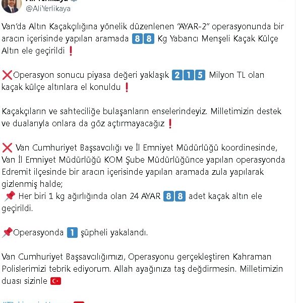 İÇİŞLERİ Bakanı Ali Yerlikaya, Vanda altın kaçakçılığına yönelik düzenlenen Ayar-2 operasyonunda 88 kilo kaçak külçe altın ele geçirildiğini duyurdu.Bakan Yerlikaya, sosyal medya hesabından yaptığı açıklamada, “Van Cumhuriyet Başsavcılığı ve İl Emniyet Müdürlüğü koordinesinde, KOM Şube Müdürlüğünce yapılan Ayar-2 operasyonunda Edremit ilçesinde bir aracın içerisinde yapılan aramada zula yapılarak gizlenmiş halde; her biri 1 kilo ağırlığında olan 24 ayar 88 adet kaçak altın ele geçirildi. Operasyon sonucu piyasa değeri yaklaşık 215 milyon TL olan kaçak külçe altınlara el konuldu. Operasyonda 1 şüpheli yakalandı” dedi.Operasyona katılan ekipleri tebrik eden Yerlikaya, “Kaçakçıların ve sahteciliğe bulaşanların enselerindeyiz. Milletimizin destek ve dualarıyla onlara da göz açtırmayacağız” ifadelerini kullandı.