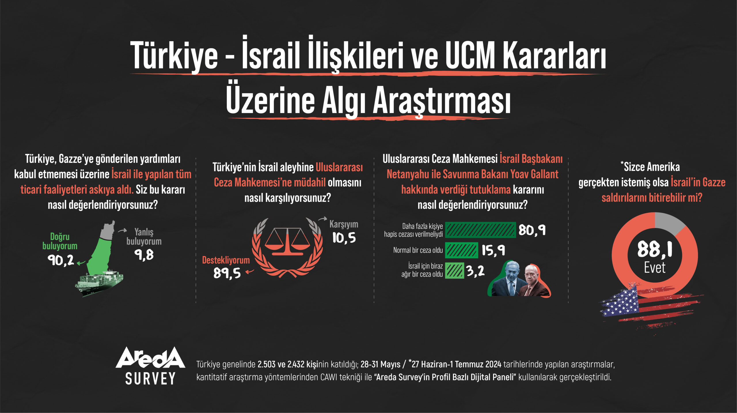 Türkiye genelinde 2 bin 503 kişiyle gerçekleştirdiği araştırmada Türk halkının yüzde 90,2’si Türkiye’nin İsrail’e uyguladığı ticaret ambargosunu destekliyor. Buna karşın yüzde 9,8’i ise bu ambargoyu desteklemiyor. Araştırma sonuçların göre Türk halkının yüzde 89,5’i, İsrail aleyhine açılan Uluslararası Ceza Mahkemesi’ne Türkiye’nin de müdahil olmasını memnuniyetle karşılarken; yüzde 10,5’i ise bu karara karşı çıkıyor.