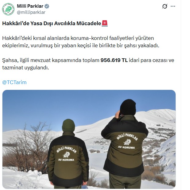 Doğa Koruma ve Milli Parklar (DKMP) Genel Müdürlüğü ekipleri, kırsal alanlarda gerçekleştirilen koruma-kontrol faaliyetleri kapsamında, bir avcıyı vurduğu yaban keçisi ile birlikte yakaladı. Avcıya 956 bin 619 TL ceza uygulandı. DKMP Genel Müdürlüğü tarafından yapılan açıklamada, “Hakkari’deki kırsal alanlarda koruma-kontrol faaliyetleri yürüten ekiplerimiz, vurulmuş bir yaban keçisi ile birlikte bir şahsı yakaladı. Şahsa, ilgili mevzuat kapsamında toplam 956 bin 619 TL idari para cezası ve tazminat uygulandı” denildi.