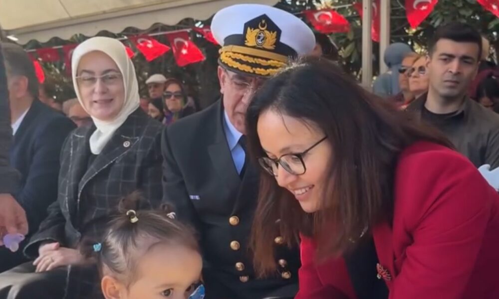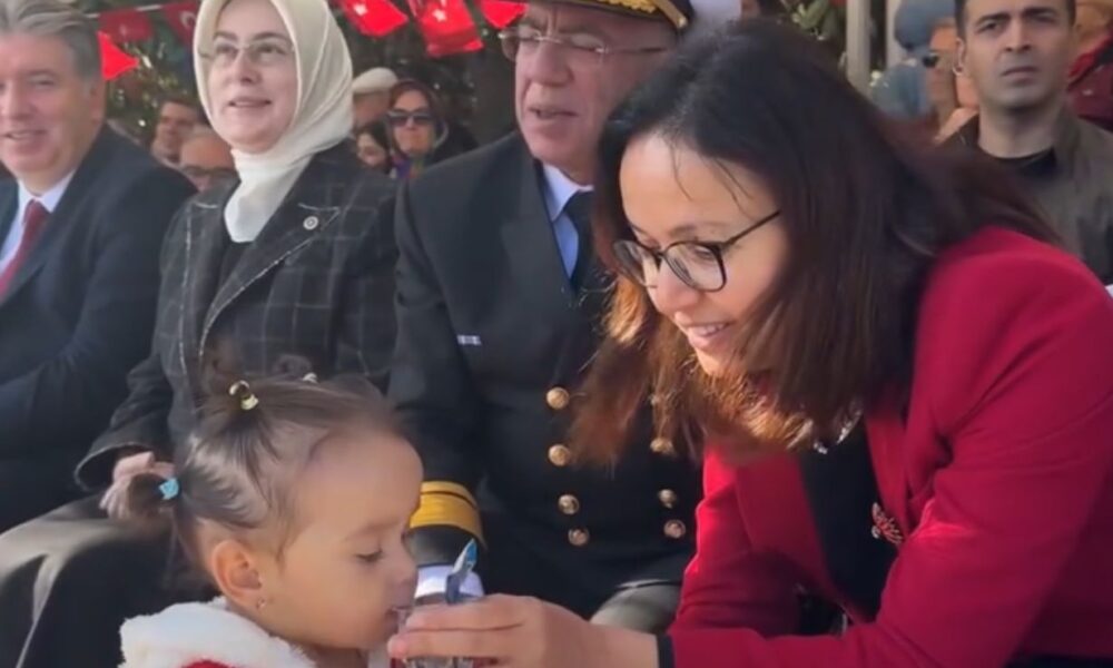 Kutlamaları izlemek için gelen bir ailenin çocuğu, elinde balon ile gezinirken protokole yaklaştı. Yalova Valisi Hülya Kaya, pet bardağa yönelen kız çocuğuna elleriyle su içirdi.