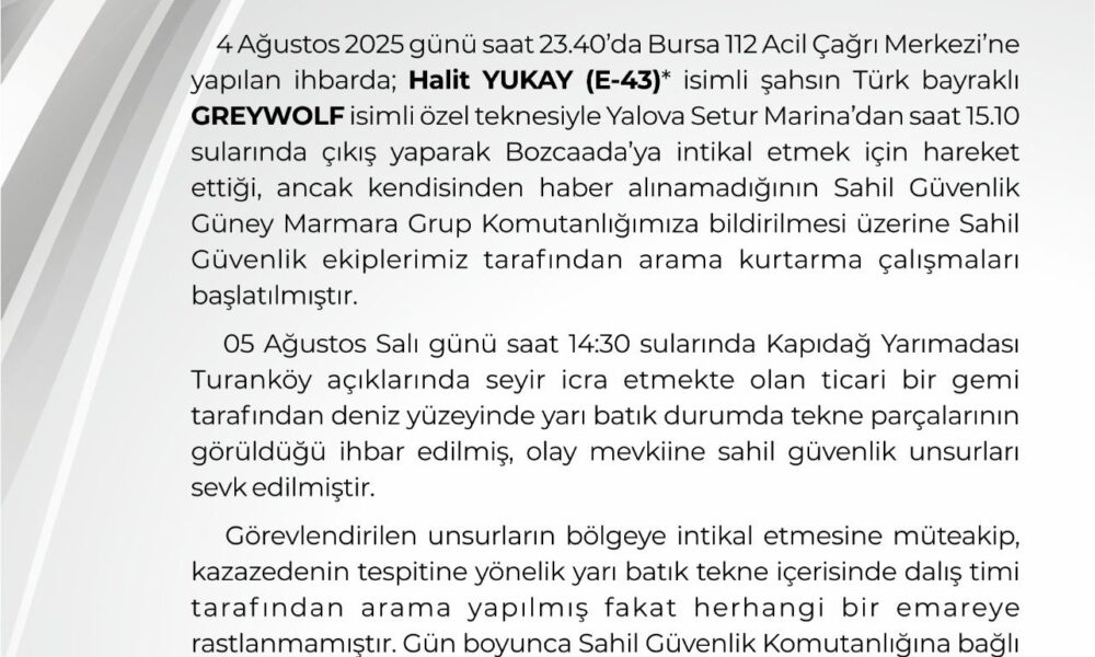 Öte yandan arama kurtarma çalışmalarıyla ilgili Balıkesir Valiliği, sosyal medya hesabından açıklama yaptı. Açıklamada, “4 Ağustos 2025 günü saat 23.40’ta Bursa 112 Acil Çağrı Merkezi’ne yapılan ihbarda; Halit Yukay (E-43) isimli şahsın Türk bayraklı GREYWOLF isimli özel teknesiyle Yalova Setur Marina’dan saat 15.10 sularında çıkış yaparak Bozcaada’ya intikal etmek için hareket ettiği, ancak kendisinden haber alınamadığının Sahil Güvenlik Güney Marmara Grup Komutanlığımıza bildirilmesi üzerine Sahil Güvenlik ekiplerimiz tarafından arama kurtarma çalışmaları başlatılmıştır.