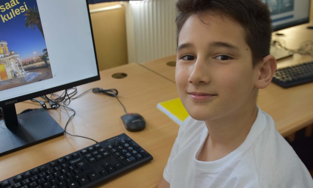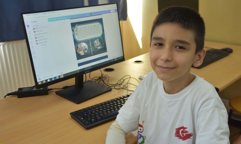 İzmir Buca 30 Ağustos Ortaokulu 5'inci sınıf öğrencileri, İzmir ile ilgili hikayeler yazıp yapay zeka araçlarını kullanarak içeriklerini dijital formata dönüştürdü.Uras Kırhan (Fotoğrafta).Fotoğraf:Nevra UÇKAÇ/İzmir,(DHA)